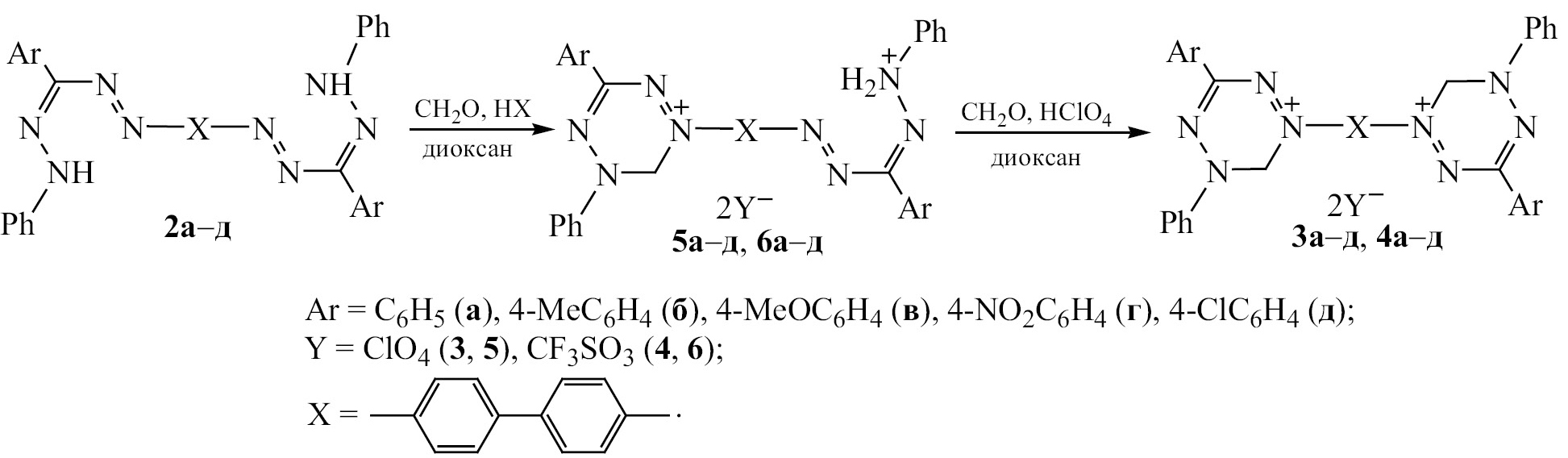 Биядерные соли 5,6-дигидро-1,2,4,5-тетразиния-1 3а–д, 4а–д получали реакцией формазанов 2a–д c 37%-ным раствором формальдегида в присутствии хлорной или трифторметансульфоновой кислоты в диоксане. По окончании реакции получившиеся соли отфильтровывали (схема 4).