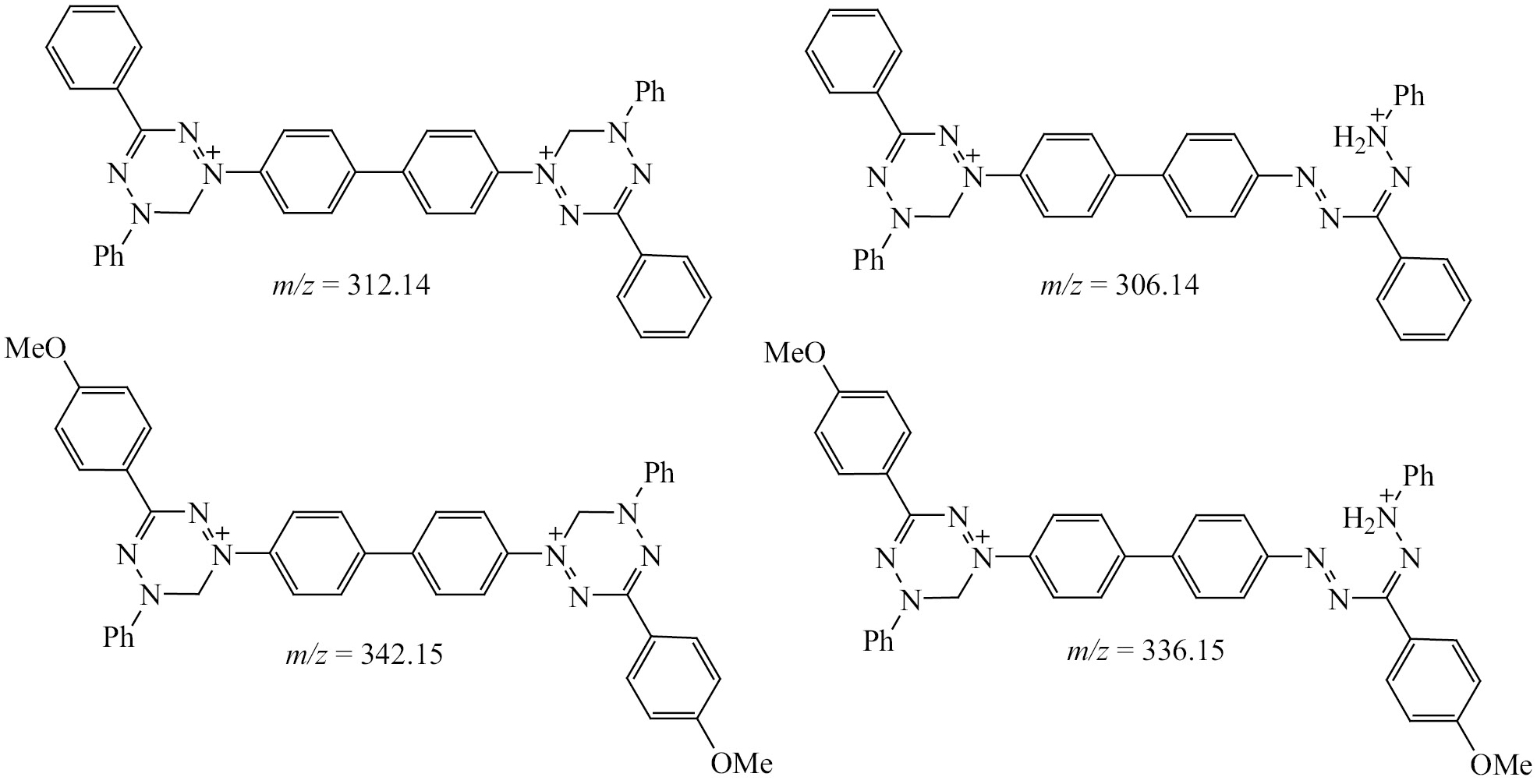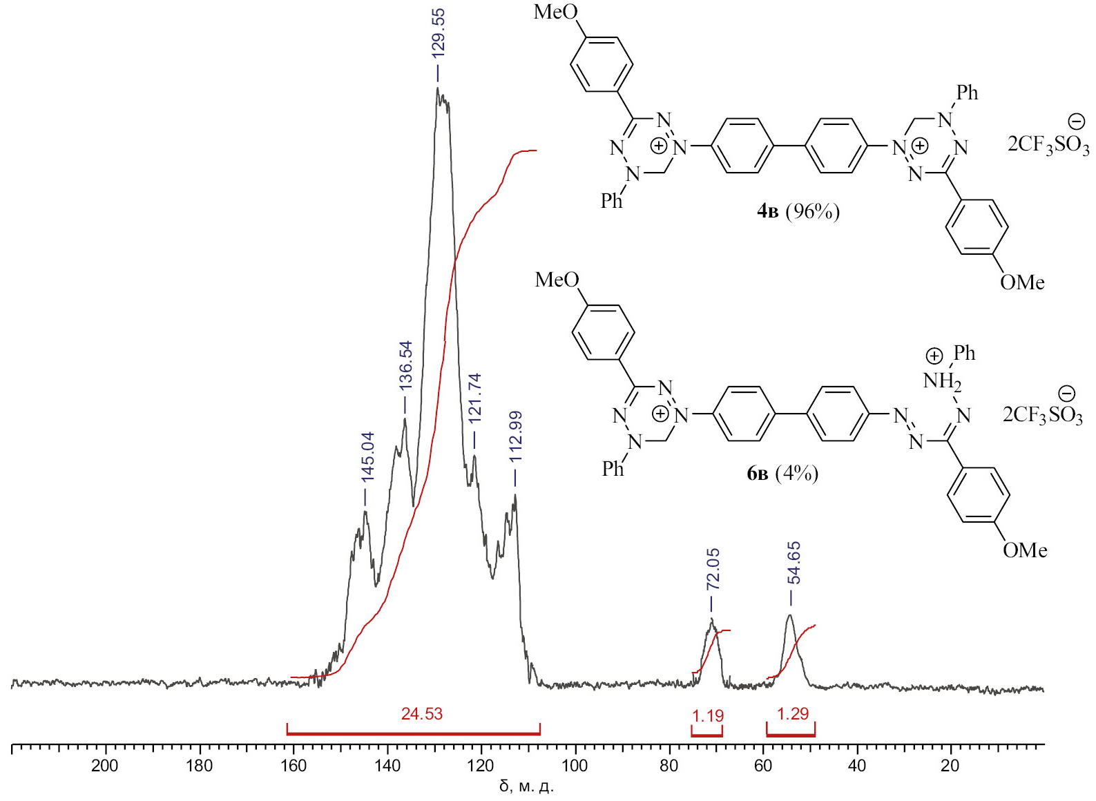 Бис(трифлат) 1,1′-([1,1′-бифенил]-4,4′-диил)бис[3-(4-метоксифенил)-5-фенил-5,6-дигидро-1,2,4,5-тетразиния-1] (4в). ИК спектр, ν, см–1: 2965 (OCH3), 1600 (С=N), 1503 (N=N), 1254, 1248 (S=O), 1037 (S=O), 765 (CF3), 643 (C–F). Спектр ЯМР CP MAS 13С, δC, м. д.: 54.6 (2С, СH3), 71.9 (CH2), 108.2–155.3 (CF3, CAr, N–C=N). Масс-спектр, m/z: 342.15. Rt = 21.3 мин.