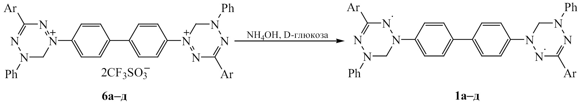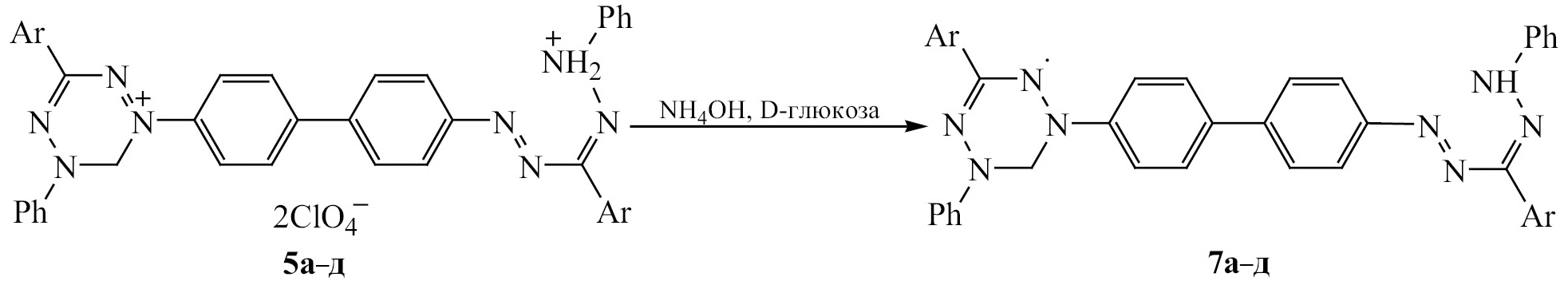 Смеси перхлоратов 3a–д и 5a–д или трифлатов 4a–д и 6a–д без разделения использовали в последующих превращениях. Интересно поведение соединений 3a–д, 4a–д, 5a–д, 6a–д в процессе получения вердазильных радикалов. Поскольку в смеси перхлоратов 3a–д и 5a–д преобладают соединения 5a–д, можно пренебречь соединениями 3a–д. Так, при обработке суспензии перхлоратов 5a–д в ацетонитриле водными растворами D-глюкозы и NH4OH, реакционная смесь вначале приобретает желтоватую окраску, а затем окрашивается вишнево-красный цвет. При этом все образующиеся продукты реакции 7а–д дают сигнал ЭПР. Предположительно происходящие превращения обусловлены следующими процессами: при восстановительной обработке D-глюкозой и NH4OH, происходит восстановление тетразиниевого катиона в радикал, при этом фрагмент формазана сохраняется, на это указывает соответствующая окраска продуктов реакции (схема 6).