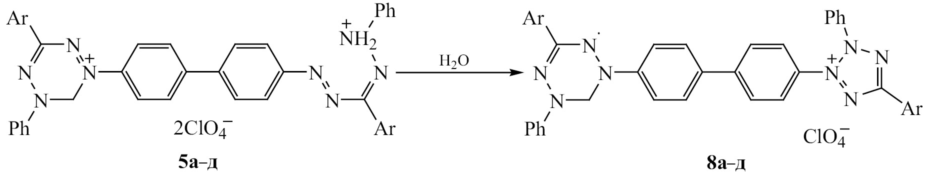 При обработке перхлоратов 5a–д только водой происходит окисление формазанового фрагмента тетразиниевым до тетразолиевого катиона, а тетразиниевый фрагмент восстанавливается до радикалов 8a–д (схема 7). Причем соединения 8a–д в отличии от соединений 7а–д имеют характерную для вердазильных радикалов зеленую окраску.