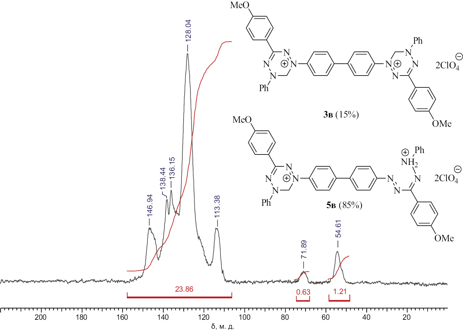 Бис(перхлорат) 5-фенил-1-{[4′-(2-фенилгидразинилидений)-(4-метоксифенил)метил]диазенил-[1,1′-бифенил]-4-ил}-3-(4-метоксифенил)-5,6-дигидро-1,2,4,5-тетразиния-1 (5в). ИК спектр, ν, см–1: 2965, 1601 (С=N), 1500 (N=N), 1252, 1104 о. с (ClO4), 1033, 840. Спектр ЯМР CP MAS 13С, δC, м. д.: 54.6 (2С, СH3), 71.9 (CH2), 115.5–151.9 (CAr, N–C=N). Масс-спектр, m/z: 336.15. Rt = 23.4 мин.