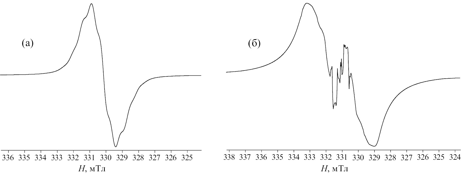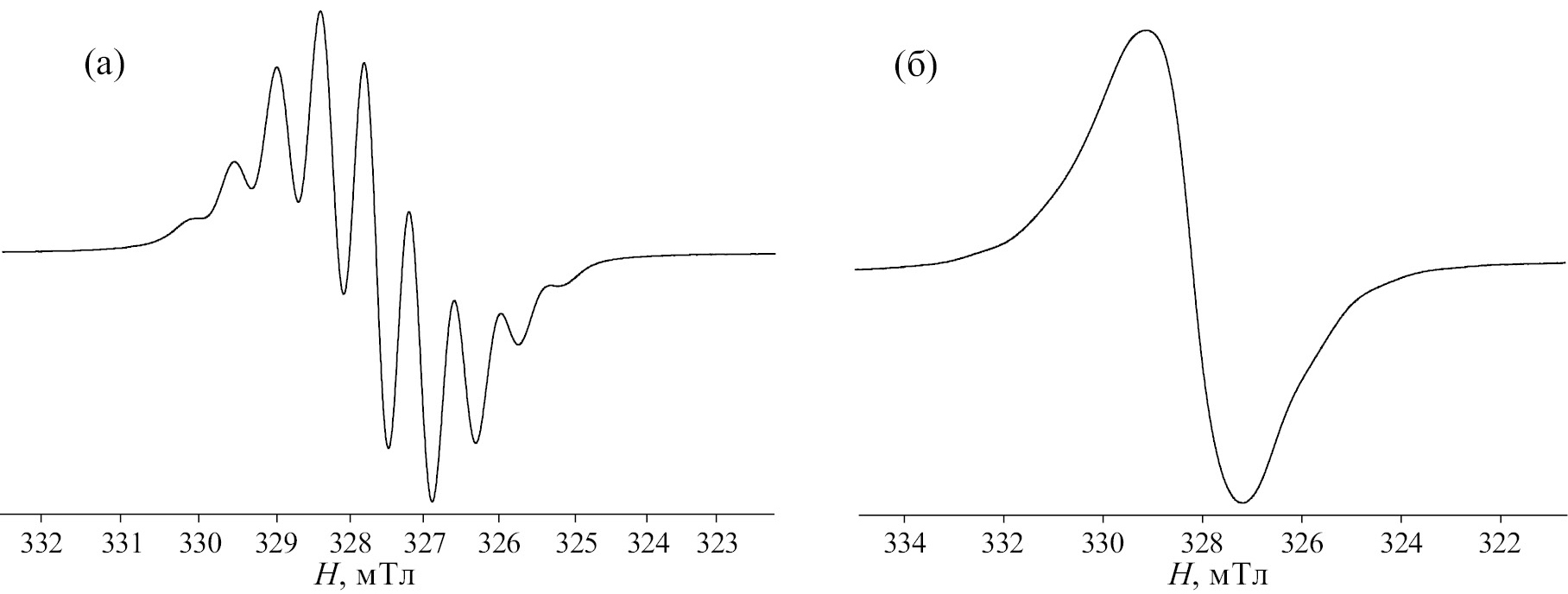 Рис. 3. Спектры ЭПР соединения 7в в бензоле (а) и твердом состоянии (б) при комнатной температуре