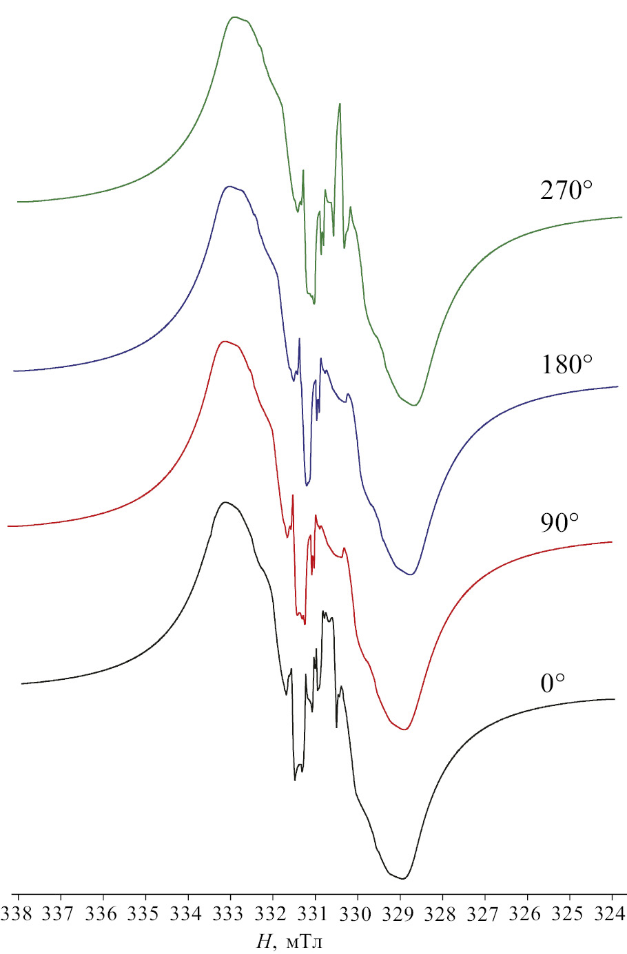 Рис. 5. Спектры ЭПР соединения 1в в твердой фазе при различных углах поворота