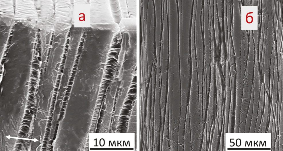 Рис. 1. Сканирующие электронные микрофотографии скола (а) и поверхности (б) исходного полиэтилентерефталата, деформированного на 100% в физически активных жидких средах. Стрелкой указано направление деформации в физически активных жидких средах