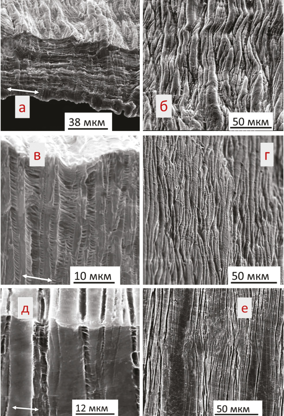 Рис. 2. Сканирующие электронные микрофотографии сколов (а, в, д) и поверхностей (б, г, е) образцов полиэтилентерефталата, деформированных в физически активных жидких средах до 100% через 1 (а, б), 24 (в, г) и 48 ч (д, е) после предварительной деформации на 25% при комнатной температуре. Стрелками указано направление деформации в физически активных жидких средах; направление деформации в физически активных жидких средах совпадает с направлением прокатки