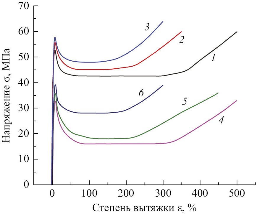На рис. 3 представлены динамометрические кривые образцов исходного полиэтилентерефталата и полиэтилентерефталата с различной степенью предварительной деформации (25 и 50%) при растяжении на воздухе (кривые 1–3) и в физически активных жидких средах (кривые 4–6) через 24 ч после прокатки. С увеличением степени предварительной деформации полиэтилентерефталата от 25 до 50% при последующем растяжении на воздухе и в физически активных жидких средах увеличиваются такие механические характеристики, как предел текучести, напряжение стационарного деформирования и разрывное напряжение. Наблюдается незначительный рост модуля упругости полимера: при растяжении на воздухе от ~860 МПа для исходного полиэтилентерефталата до ~880 и ~900 МПа для предварительно деформированного на 25 и 50% полиэтилентерефталата соответственно; при растяжении в физически активных жидких средах – от ~730 МПа для исходного полиэтилентерефталата до ~750 и ~770 МПа для предварительно деформированного на 25 и 50% полиэтилентерефталата соответственно. Отметим, что с увеличением степени предварительной деформации диапазон стационарного развития деформации значительно сокращается по сравнению с исходным полиэтилентерефталатом при растяжении как на воздухе, так и в физически активных жидких средах. Ранее было показано, что протяженность данного участка связана с величиной естественной степени вытяжки полимера λ, которая определяется характерной для данного полимера плотностью сетки зацеплений [4]. Уменьшение протяженности участка плато на динамометрических кривых при увеличении степени предварительной ориентации полиэтилентерефталата обусловлено, очевидно, ростом объемной доли полимерного материала в крейзах, которая обратно пропорциональна естественной степени вытяжки полимера [4].