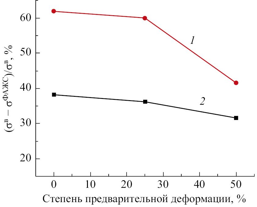Для определения эффективности действия физически активных жидких сред при увеличении степени предварительной деформации образцов полиэтилентерефталата от 25 до 50% проведено сопоставление предела текучести σт и напряжения стационарного развития деформации σст при растяжении полимера на воздухе и в физически активных жидких средах. На рис. 4 представлены зависимости относительного понижения соответствующих величин при растяжении полимера в физически активных жидких средах по сравнению с воздухом (σв – σФАЖС)/σв, где σв и σФАЖС – предел текучести полимера на воздухе и в физически активных жидких средах соответственно. Как следует из рис. 4, для прокатанных образцов эффективность действия среды (σв – σФАЖС)/σв понижается по мере увеличения степени предварительной деформации. Отметим, что при исследуемых степенях предварительной деформации (не более 50%) способность полиэтилентерефталата к крейзингу не подавляется. Этот результат является вполне закономерным, так как общий уровень ориентации полимерных цепей остается относительно невысоким.