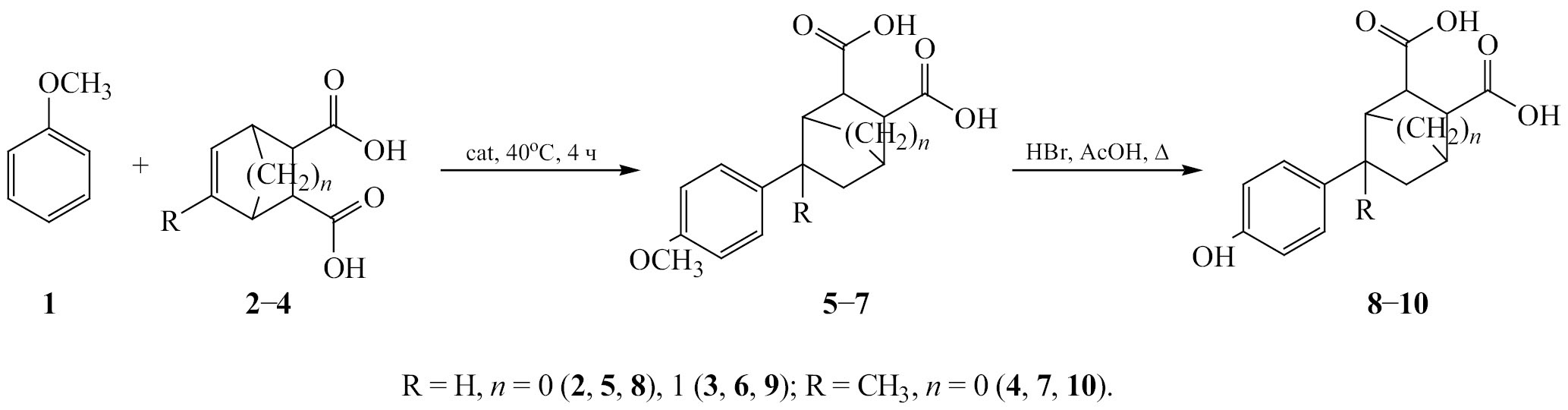 Таким образом, рассмотрен новый подход к синтезу 4-(4-гидроксифенил)циклоалкандикарбоновых кислот, а именно последовательными стадиями SEAr алкилирования по Фриделю–Крафтсу и расщеплением эфирной связи. Подобраны условия взаимодействия анизола с непредельными дикарбоновыми кислотами, позволяющие получать целевые продукты с высоким выходом (температура 40–45°С, 4 ч). Впервые показано, что для синтеза 4-(4-гидроксифенил)циклоалкандикарбоновых кислот применимы в качестве катализатора хлорид алюминия, хлорид железа, n-толуолсульфоновая кислота. Расщепление эфирной связи арилалкиловых эфиров бромоводородной кислотой в среде водной уксусной кислоты при кипячении приводит к образованию целевых продуктов с удовлетворительным выходом (70–80%).