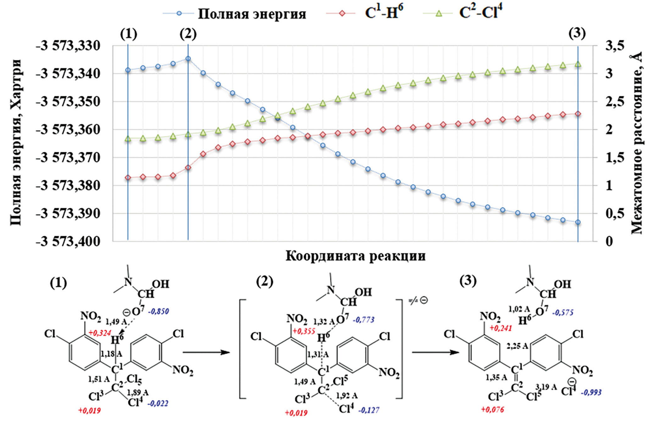 Рис. 1. Энергетические профиль и динамика изменения межатомного расстояния (H6–C1, C2–Cl4) реакции дегидрохлорирования 2,2-ди(3-нитро-4-хлорфенил)-1,1,1-трихлорэтана карбанионом диметиламинометандиола (О-атака). Пространственные структуры предреакционного (1), активированного (2) и постреакционного комплексов (3). Заряд на атомах по Малликену (а. е.) дан курсивом.