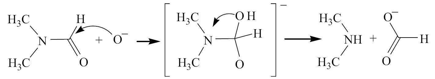 N,N-Диметилформамид (ДМФА) и N,N-диметилацетамид (ДМАА), применяемые в многообразии химических процессов, не являются абсолютно инертными растворителями и могут взаимодействовать с различными нуклеофильными реагентами. Практическим аспектом изучения процесса щелочного гидролиза амидных растворителей является применение его для введения диметиламиногруппы в молекулы различных субстратов. Образующиеся продукты при щелочном гидролизе амидных растворителей, прежде всего промежуточный анион и диметиламин могут выступать в качестве реагентов в конкурирующих процессах, протекающих наряду с основной реакцией [5–9].