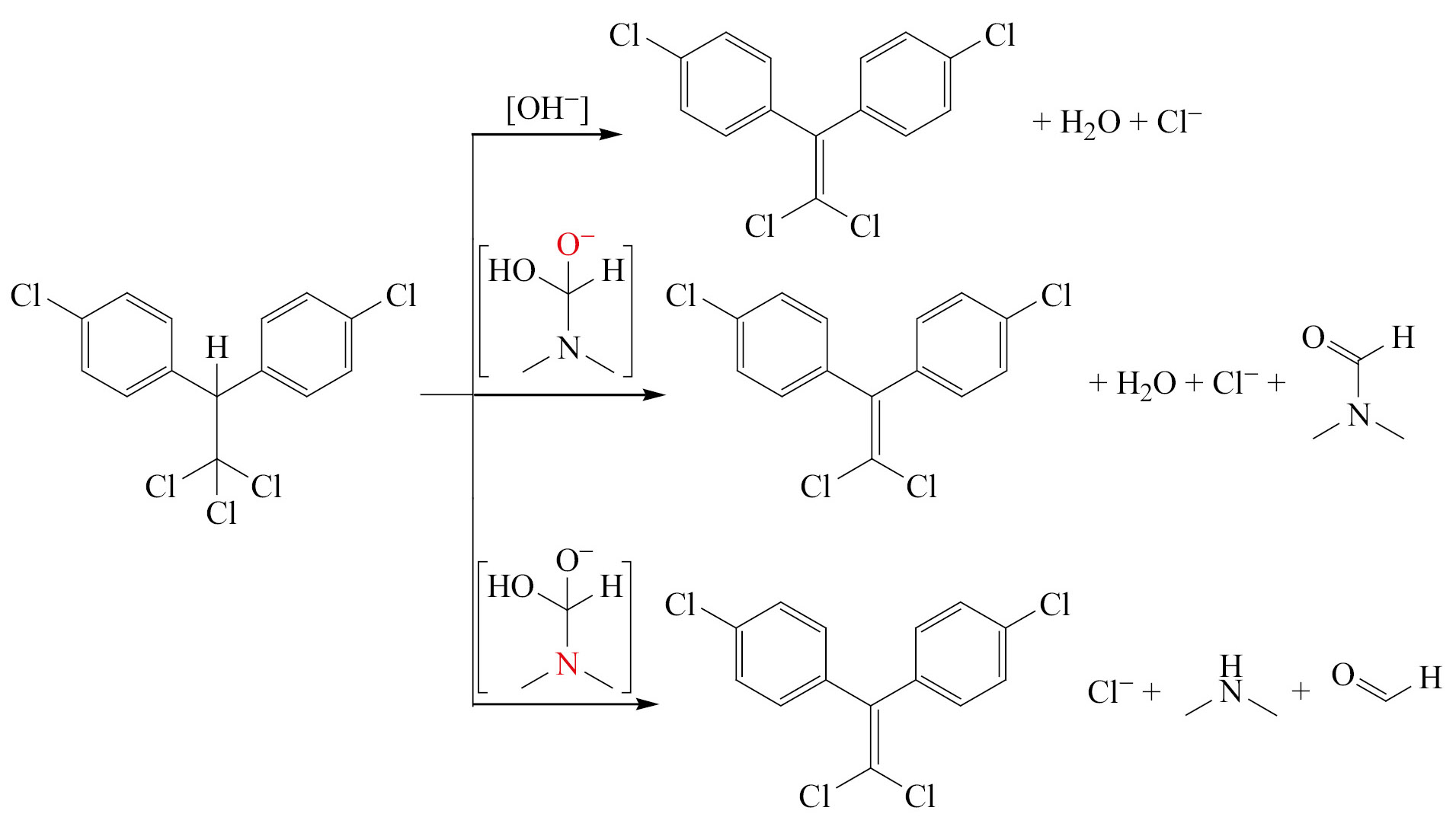 Авторами работ [10–13] изучены закономерности превращения нитрозамещенных 2,2-бис(4-хлорфенил)-1,1,1-трихлорэтанов и 4,4′-дихлорбензофенонов в системе NaOH–ДМФА. Диметиламин или промежуточный анион являются нуклеофильными реагентами, конкурирующими наряду с анионом OH– за субстрат. Результат реакций – образование диметиламинозамещенного продукта или смеси его с гидроксизамещенным соединением, соотношение которых зависит от температуры реакции. С повышением температуры доля диметиламинозамещенного продукта в смеси возрастает, что можно объяснить увеличением скорости гидролиза ДМФА и, соответственно, концентрации диметиламинного нуклеофила.
