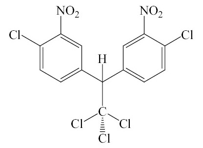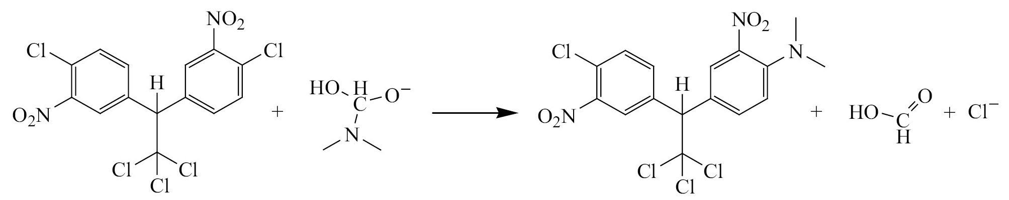 Однако, проведенные препаративные исследования не дают возможности однозначно определить последовательность протекания реакций. Нуклеофильное замещение атомов хлора на диметиламиногруппы может быть реализовано как для 2,2-ди(3-нитро-4-хлорфенил)-1,1,1-трихлорэтана, так и для продукта реакции дегидрохлорирования - 2,2-ди(3-нитро-4-хлорфенил)-1,1-дихлорэтена.