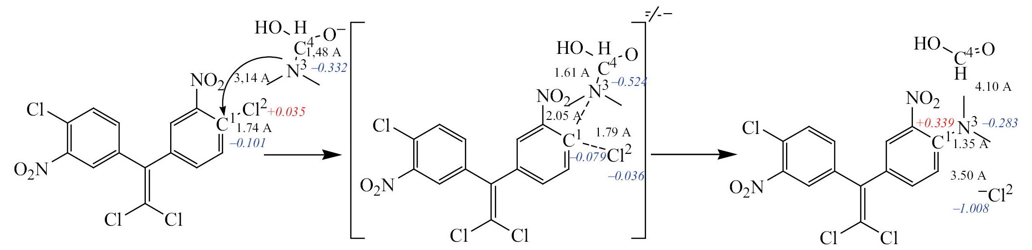 Следует отметить, что молекула 2,2-ди(3-нитро-4-хлорфенил)-1,1,1-трихлорэтана находится в антиперипланарной конформации. Для реакции дегидрохлорирования 2,2-ди(3-нитро-4-хлорфенил)-1,1,1-трихлорэтана карбанионом N,N-диметиламинометандиола (О-атака) смоделированы пространственные структуры и рассчитаны энергетические параметры предреакционного, активированного и постреакционного комплексов (рис. 1).