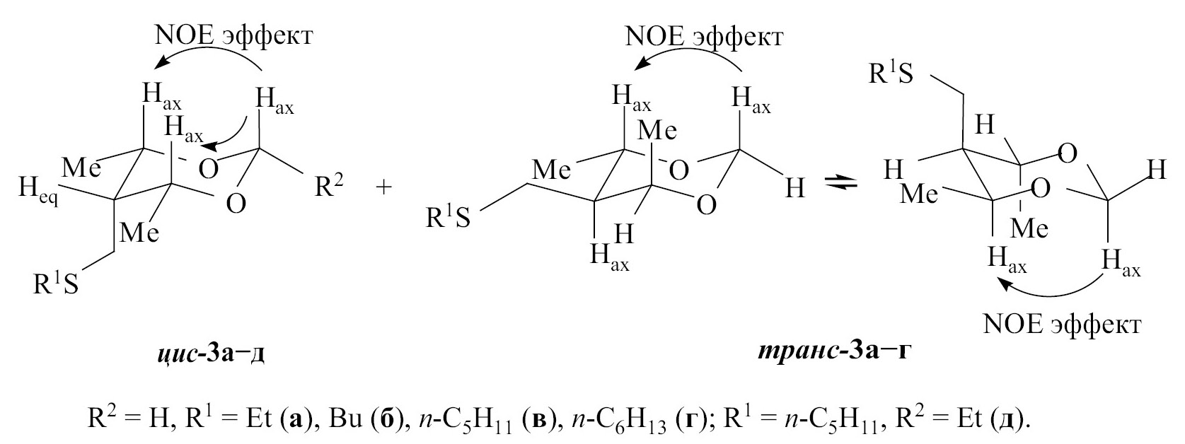 В спектрах ЯМР 1H 4,6-цис-изомеров 3a–г метиленовые протоны при атоме С2 в 1,3-диоксациклогексановом цикле различаются и резонируют в виде двух дублетов (4.69–4.73 и 4.96–5.03 м. д.) с геминальной КССВ (2J2-CHаx,2-CHeq) 6.0 и 6.1 Гц, что позволяет предположить конформационную заторможенность цикла и смещение равновесия в сторону преобладания кресловидной формы [39, 40] (схема 2). В спектрах ЯМР 13С и 1H химические сдвиги атомов углерода и протонов групп С6-Me и С4-Me, а также C4H и С6H попарно совпадают и свидетельствуют об эквивалентности этих фрагментов. В спектрах ЯМР 1H–1H NOESY 4,6-цис-изомеров 3a–г наблюдается кросс-пик между сигналами аксиального протона С2Hax (4.69–4.73 м. д.) и протонов С4(6)Hаx, что указывает на их пространственную сближенность, диаксиальную ориентацию и, как следствие, цис-диэкваториальное расположение метильных групп. В спектрах ЯМР 1H сигналы протонов С4(6)Hax образуют квартет дублетов с вицинальными КССВ 3J4(6)-CHаx, Me-CH 6.5 Гц и 3J4(6)-CHаx,5-СHeq 1.8 Гц, величина последней является доказательством экваториальной ориентации протона С5Heq и, следовательно, аксиального расположения алкисульфанилметильной группы. Предпочтительность аксиального расположения заместителя СH2SMe в 5-замещенном 1,3-диоксане объясняется возможностью стабилизации конформации кресло за счет взаимодействия атомов кислорода цикла c углеродными атомами метиленовой группы серосодержащего заместителя [41].