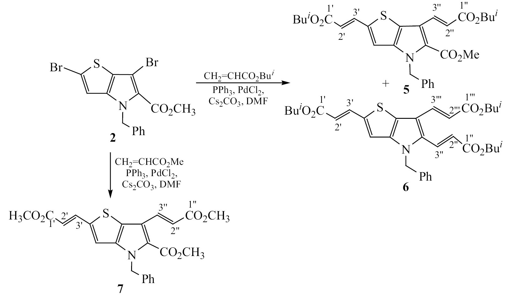В данной работе на основе ранее синтезированных дибромидов 1, 2 [11] и метиловых эфиров 4-метил- и 4-бензил-4H-тиено[3,2-b]пиррол-5-карбоновой кислот [12] получены новые кросс-сопряженные продукты по реакции Хека применением изобутилового эфира акриловой кислоты. Реакцию проводили с избытком изобутилакрилата в присутствии системы PdCl2–PPh3–Cs2CO3 в кипящем ДМФА, контролируя ход реакции методом ТСХ.