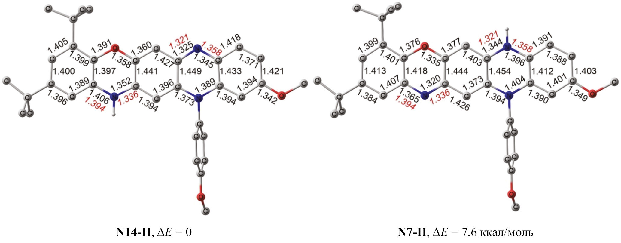 При проведении реакции (схема 1) в кислой среде протонирование исходного QOPO 1 может происходить по донорным атомам азота как оксазинового, так и пиразинового циклов, приводя к изомерным структурам N14-H и N7-H соответственно. Согласно данным DFT B3LYP/6-311G++(d,p) расчетов (рис. 3) альтернативная форма N7-H значительно дестабилизирована относительно формы N14-H и, следовательно, протонирование QOPO 1 должно преимущественно осуществляться по атому азота его оксазинового цикла с сохранением исходной 12Н-хиноксалино[2,3-b]феноксазиновой изомерной формы лиганда. Сопоставление вычисленных длин связей в гетероциклах с данными РСА (рис. 1) показывает, что отклонения рассчитанных длин связей C–N в структуре N14-H от экспериментальных почти не превышает 0.01 Å, в то же время в структуре N7-H разница доходит до 0.04 Å.