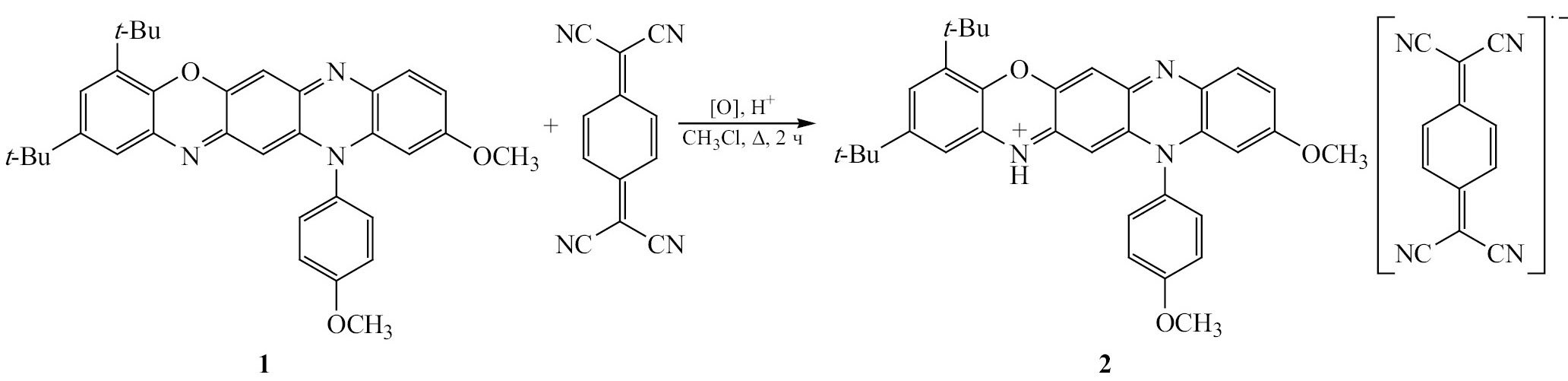 Реакция 2,4-ди-(трет-бутил)-10-метокси-12-(4-метоксифенил)-12Н-хиноксалино[2,3-b]феноксазина 1 с тетрацианхинодиметаном протекает гладко в растворе хлороформа в аэробных условиях при комнатной температуре при добавлении каталитических количеств концентрированной соляной кислоты и ведет к получению солеобразного комплекса переноса заряда (КПЗ) типа D+/A•– 2 (схема 1). В КПЗ 1•+/TCNQ•–, образующемся на первой стадии реакции, исходный донорный лиганд QOPO находится в форме катион-радикала, который при осуществлении реакции в присутствии кислорода воздуха быстро окисляется до катиона в составе комплекса 2.