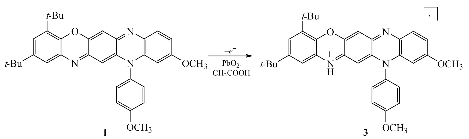 С целью дальнейшего исследования высокой подвижности электронной системы соединений хиноксалино[2,3-b]феноксазинового ряда нами также изучены реакции окисления 2,4-ди-(трет-бутил)-10-метокси-12-(4-метоксифенил)-12H-хиноксалино[2,3-b]феноксазина 1 другим сильным π-акцептором – 3,6-ди-(трет-бутил)-о-хиноном, а также двуокисью свинца. Одноэлектронное окисление протонированной формы 1 двуокисью свинца в среде ледяной уксусной кислоты приводит к образованию его стабильного катион-радикала 3 (схема 2). Спектр ЭПР катион-радикала представлен на рис. 5.