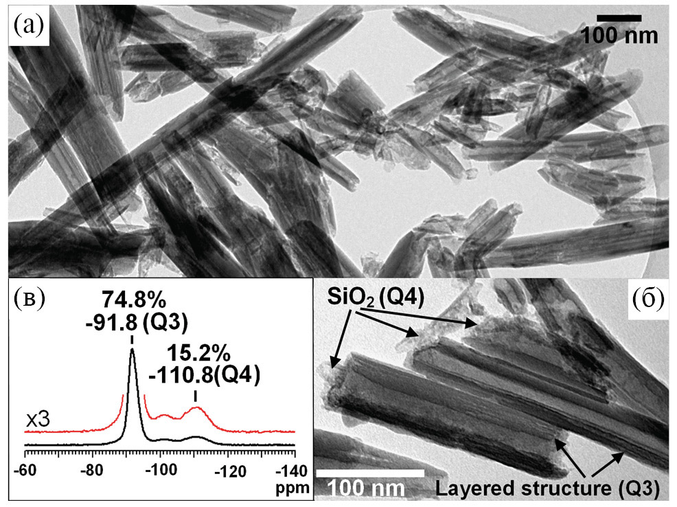 Рис. 1. Изображение галлуазитовых нанотрубок, обработанных 5.0 н. HCl (а, б), и их спектр ЯМР 29Si (в). Воспроизведено из [52] с разрешения.