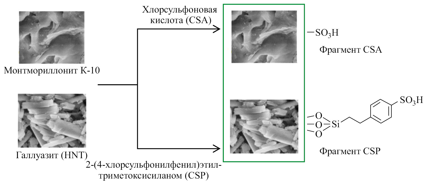 Кислотную функционализацию алюмосиликатов можно осуществить путем прикрепления сульфоновых групп (SO3H) к их поверхности (рис. 2). Так, монтмориллонит К-10 и галлуазит предварительно обрабатывали хлорсульфоновой кислотой (CSA) или 2-(4-хлорсульфонилфенил)этилтриметоксисиланом (CSP) и тестировали в реакции (–)-изопулегола с бензальдегидом, используя последний в качестве реагента и растворителя [49]. Высокая селективность по образующемуся октагидро-2H-хроменолу (95.0%, 4R/4S = 5.5) наблюдалась в присутствии K10-CSP, при этом функциональные группы на поверхности этого катализатора не подвергались «смыванию» (личингу) в ходе реакции. На обработанном CSP галлуазите соотношение образующихся 4R- и 4S-изомеров составляло 11.5, однако общий выход хроменола не превышал 35.0% [49].