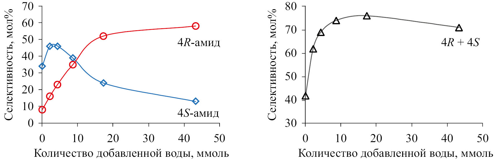 Углеродные нанотрубки (CNT) и монтмориллонит К-10, функционализированные хлорсульфоновой кислотой (CSA), использовали в качестве катализаторов реакции Принса–Риттера (–)-изопулегола с бензальдегидом в ацетонитриле (схема 14) [70]. Обнаружено необычно сильное влияние количества воды в системе на общую селективность по амидам и соотношение их стереоизомеров (рис. 3) в случае как гетерогенного, так и гомогенного (п-толуолсульфокислота) катализа [70]. Образование 4S-амида термодинамически предпочтительно при 30°C, что подтверждается расчетами методом DFT и экспериментальными данными [70]. Введение воды приводит к резкому увеличению скорости реакции и селективности по 4R-амиду из-за перехода к кинетическому контролю реакции, что приводит к инверсии стереоселективности и резкому увеличению общего выхода амидов (рис. 3), достигающем 83.0% на CNT-CSA, что выше, чем в присутствии трифторметансульфоновой кислоты (62.0%).