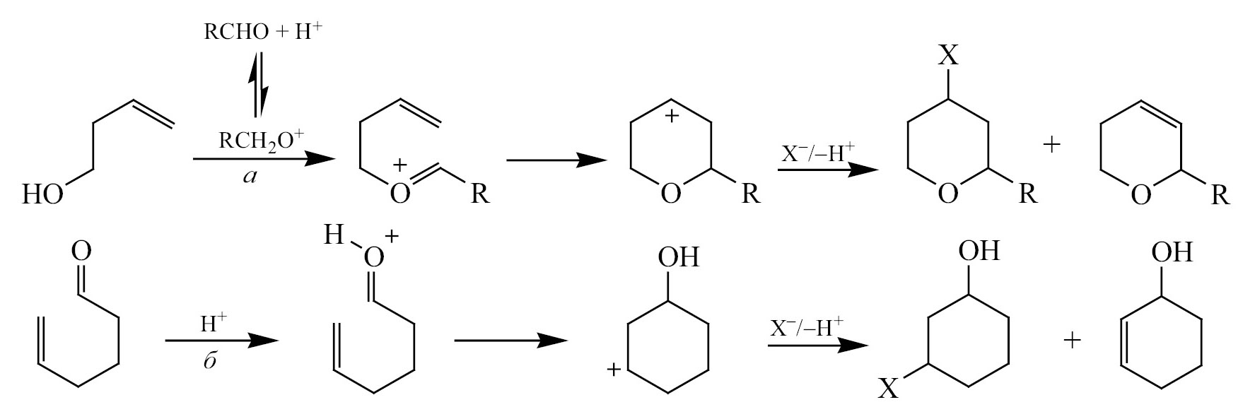 Кислотно-катализируемая реакция конденсации ненасыщенных углеводородов с карбонильными соединениями была открыта в 1919 г. голландским химиком Х. Принсом [1] и до настоящего времени является инструментом в синтезе соединений различного функционального назначения, используемых, например, в парфюмерии, медицине, обладающих биологической активностью [1–3]. Реакция Принса представляет собой универсальный способ получения кислородсодержащих гетероциклических соединений, ключевой стадией которого является образование иона оксокарбения, который реагирует с алкеновым фрагментом межмолекулярным (схема 1, а) или внутримолекулярным путем (схема 1, б) [2].
