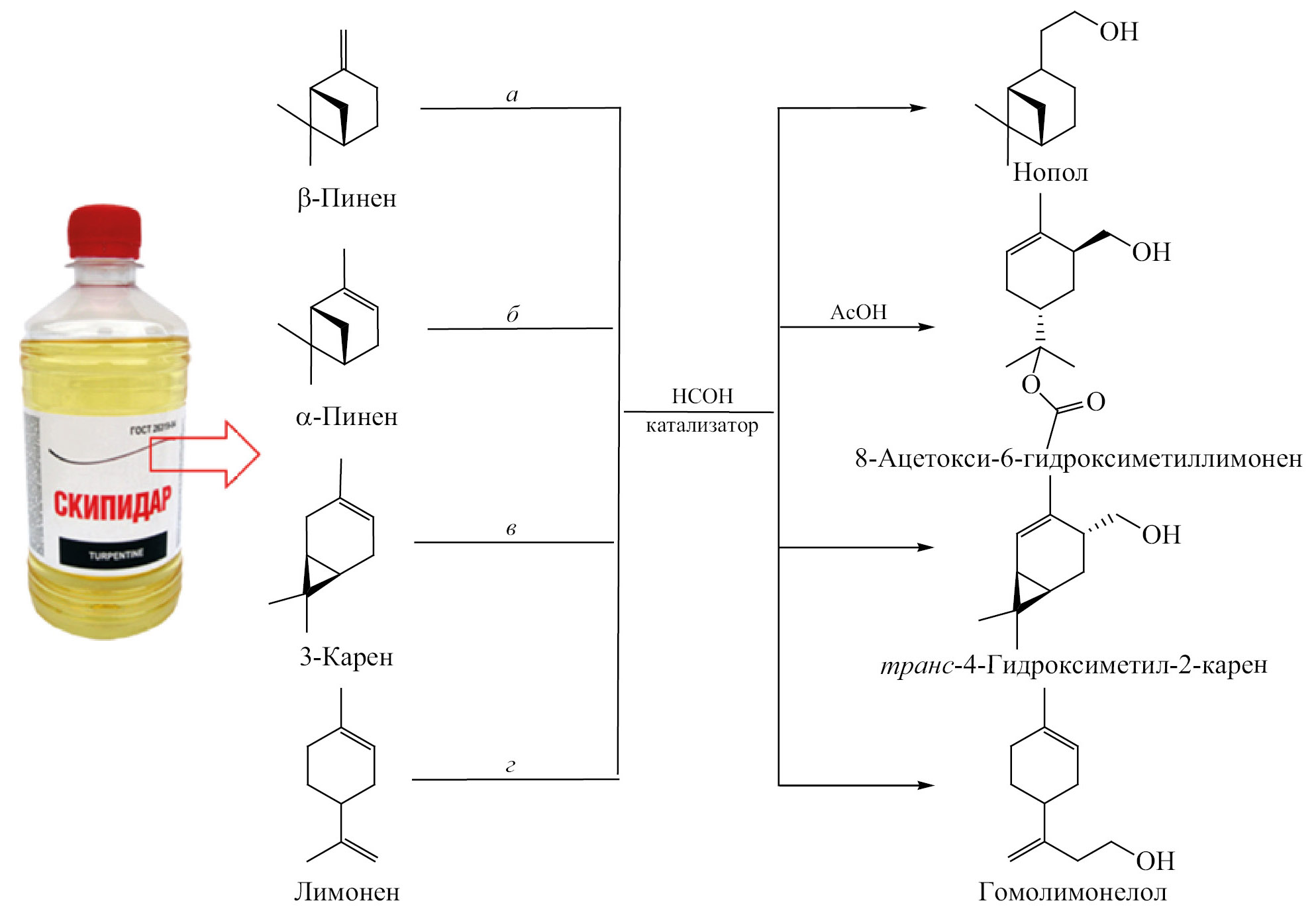 Недавно [18] изучена каталитическая конденсация (–)-α-пинена с формальдегидом, получен новый терпеноид 8-ацетокси-6-гидроксиметиллимонен (схема 3). Показано, что традиционные кислоты Льюиса и Бренстеда катализируют реакцию в уксусной кислоте, однако селективность по этому соединению не превышает 24.0% из-за протекания побочных превращений. Так, на слабокислотных галлуазитовых нанотрубках (45.0 мкмоль/г) преимущественно образуются продукты прямого протонирования α-пинена (терпинилацетат и др).