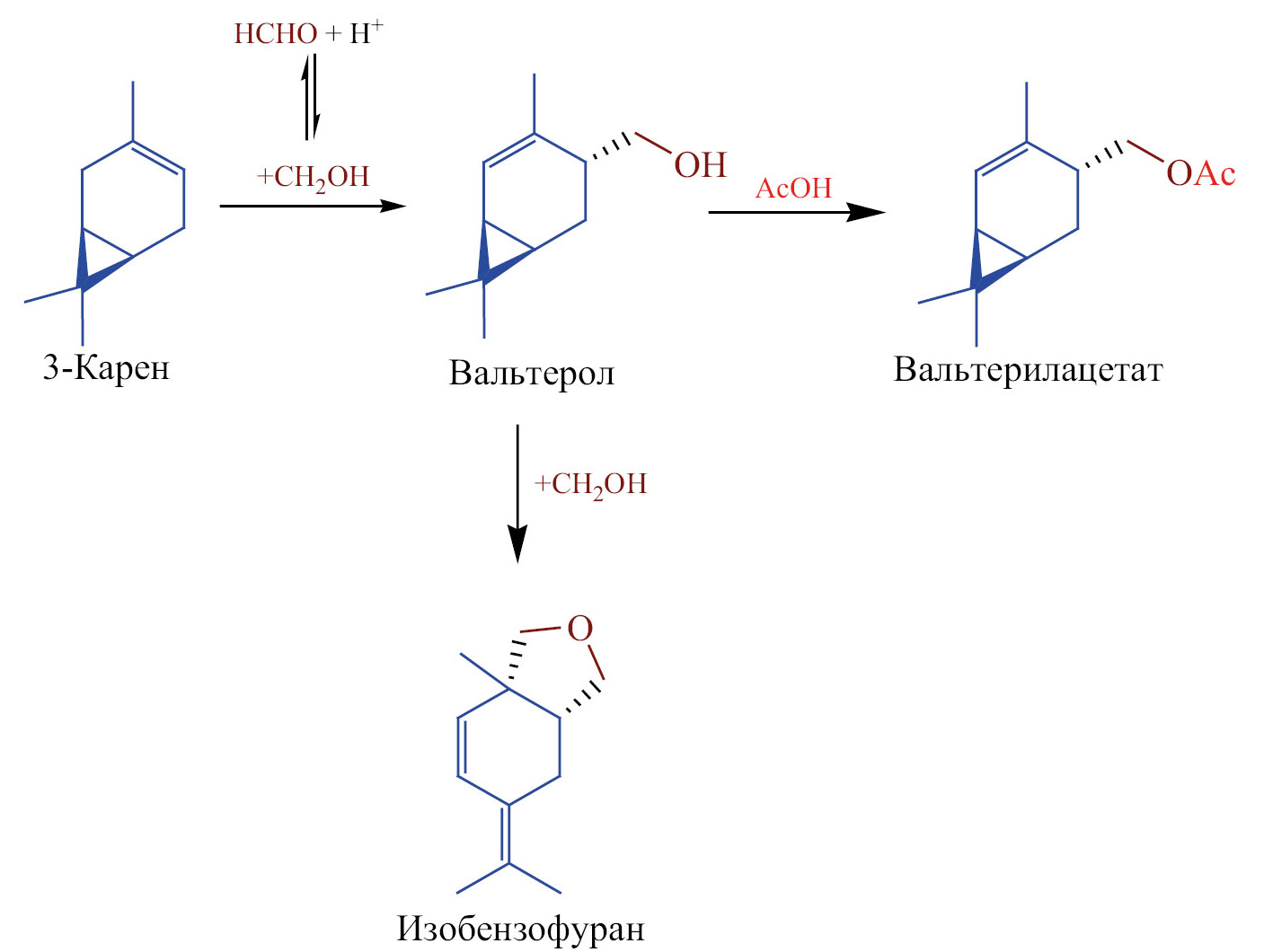 Последовательная реакция конденсация вальтерола с формальдегидом преимущественно протекает в присутствии кислот Льюиса (ZnCl2, LiClO4), а на слабо и умеренно кислых (45.0–104.0 мкмоль/г) алюмосиликатах (монтмориллонит, галлуазит) наблюдается низкая конверсия (24.0–34.0%) 3-карена с преобладанием продуктов ацетилирования [24]. Наибольшая селективность по транс-4-гидроксиметил-2-карену (50.0%) наблюдается при использовании фосфорной кислоты. Показано, что выход этого продукта увеличивается до 66.0% при избытке формальдегидом или катализатора, поскольку количество активной формы формальдегида является ключевым фактором в протекании реакции. Квантово-химические расчеты методом теории функционала плотности (DFT) показали, что дальнейшие превращения вальтерола термодинамически выгодны, что подтверждается экспериментально. Реакция масштабировалась до 25 г, показана возможность выделения и повторного использования непрореагировавшего 3-карена [24].