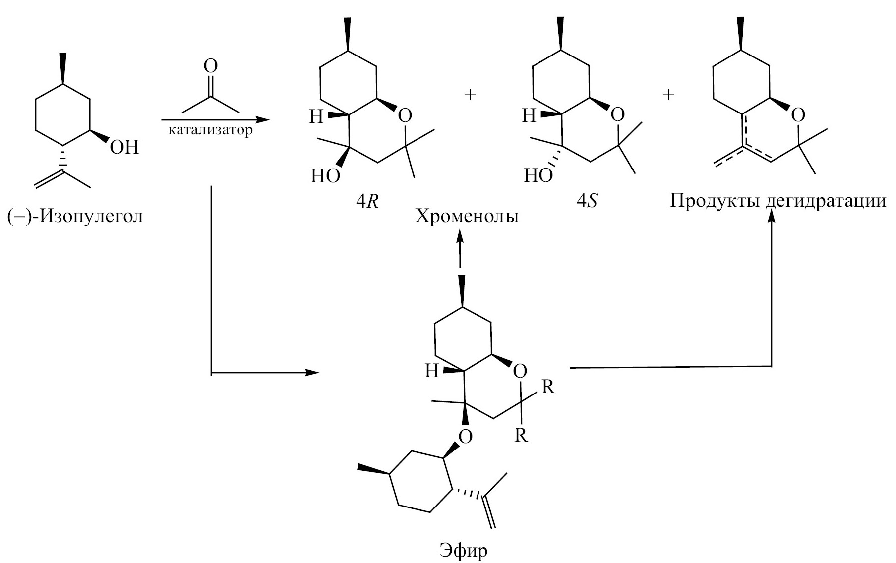 Конденсация (–)-изопулегола с кетонами протекает менее избирательно, чем в случае альдегидов. Так, при использовании алифатических и циклических кетонов в присутствии катализатора Н+-К-10 получен ряд новых октагидро-2Н-хромен-4-олов с выходами до 57.0% [51]. Показано, что при использовании ацетона образующийся 4R-изомер проявляет высокую активность против вирусов гриппа H1N1 и H2N2. Учитывая фармацевтический потенциал этого продукта, проведены дальнейшие исследования по созданию селективных катализаторов реакции Принса с участием кетонов [52–54]. Так, галлуазитовые нанотрубки, обработанные 5.0%-ным раствором HCl, использовались в качестве катализаторов в реакции конденсации (–)-изопулегола с ацетоном [52]. В мягких условиях (30°С, без использования растворителя) отмечалась сравнительно высокая селективность по хроменолам (до 77.0%, 4R/4S = 8.2) с препаративным выходом 4R-изомера 66.0%. Показано, что механизм реакции более сложен, чем в случае с альдегидами (схема 8) и включает образование хроменолов за счет присоединения воды к циклическому интермедиату, а также его дальнейшее взаимодействие с изопулеголом, приводящему к образованию эфира, который после гидролиза преимущественно дает продукты дегидратации, что, по-видимому, является причиной относительно низкой селективности по хроменолам [52].