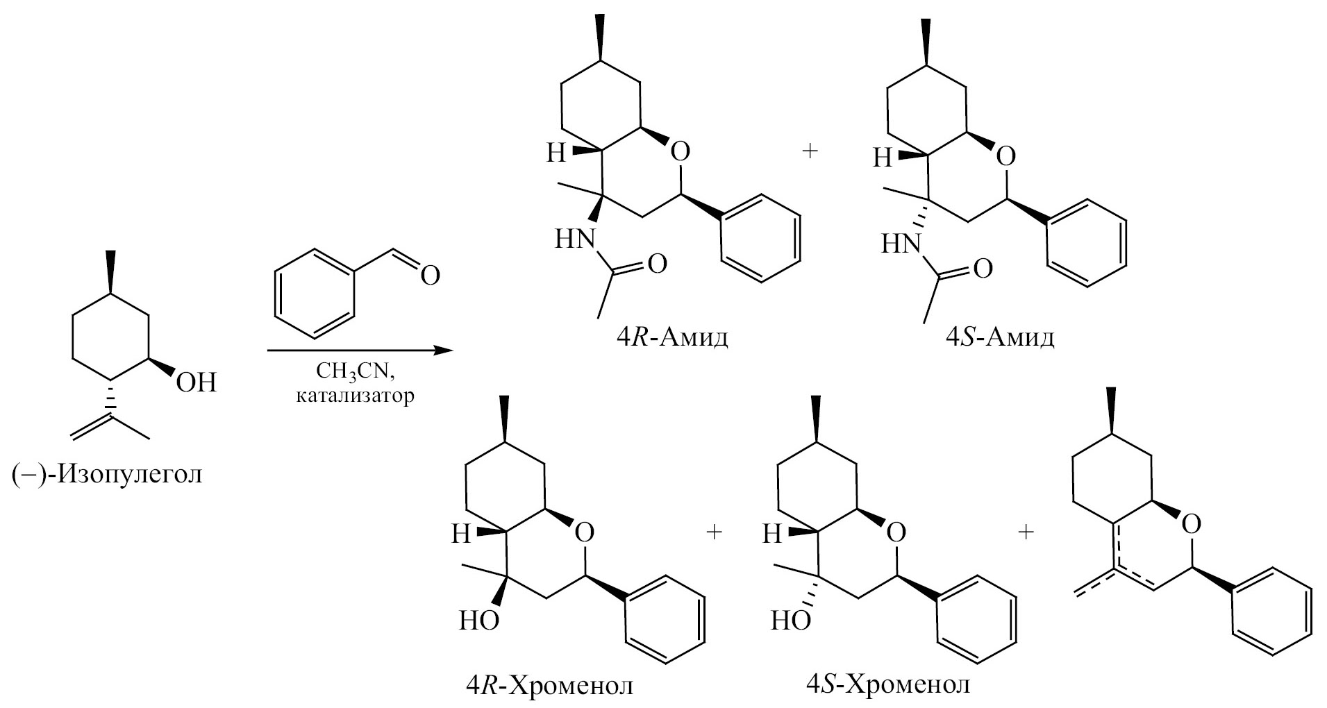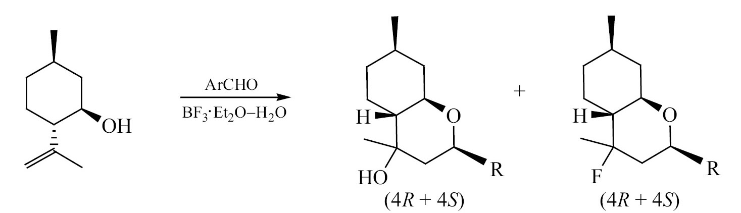 Возможность конденсации (–)-изопулегола с ароматическими и алифатическими альдегидами (схема 7) в присутствии гетерогенного катализатора (монтмориллонита К-10) при микроволновом излучении показана в работе [42]. Продуктами реакции являются замещенные октагидро-2Н-хромен-4-олы в виде 4R- и 4S-изомеров, общие выходы которых составляли до 86.0% в случае 4-метил- и 4-метоксизамещенных бензальдегидов.