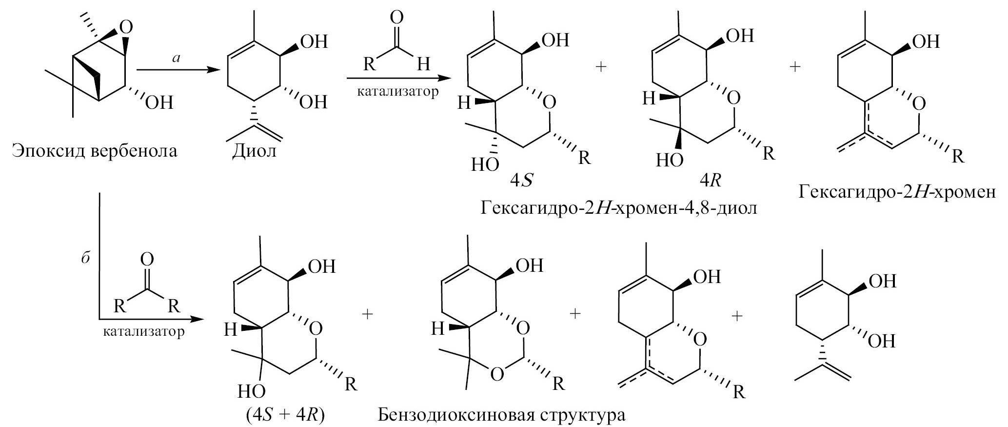 При использовании эпоксида вербенола в реакции с альдегидами, исключая стадию его изомеризации в диол (схема 10, б), помимо хромендиолов, наблюдалось образование продуктов с бензодиоксиновой структурой [56].