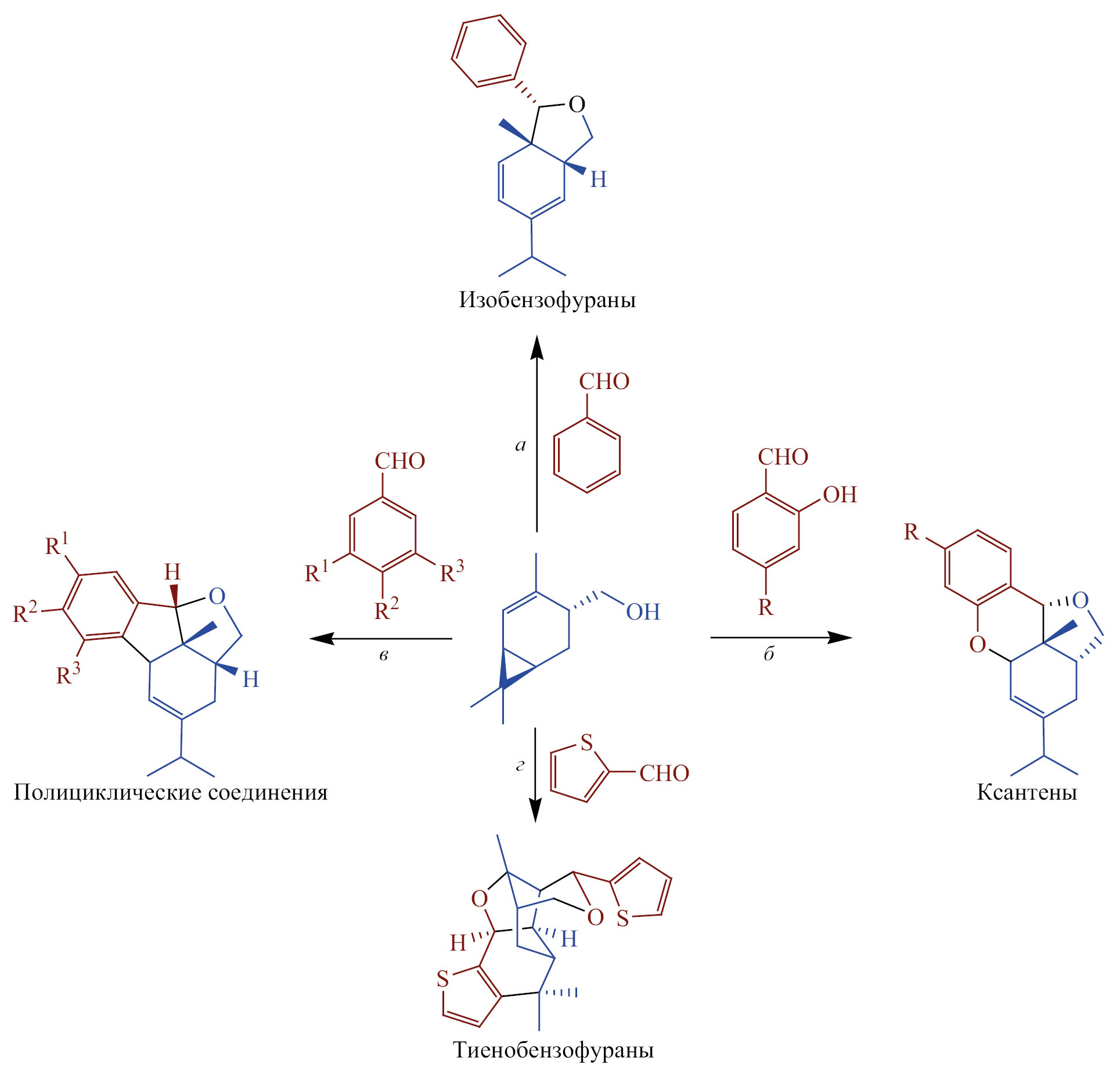 Терпеновый углеводород 2-карен в присутствии монтмориллонита К-10 реагирует с альдегидами (схема 5, б) с образованием гексагидроизобензофурана, а также 3-оксабицикло[3.3.1]ноненовых соединений [32]. В образовании изобензофуранового фрагмента участвует циклопропановое кольцо этого терпена, по-видимому, за счет его сопряжения с двойной связью. В случае конденсации 3-карена с формальдегидом бензофурановая структура формируется за счет присоединения второй молекулы формальдегидом (схема 4) [24].