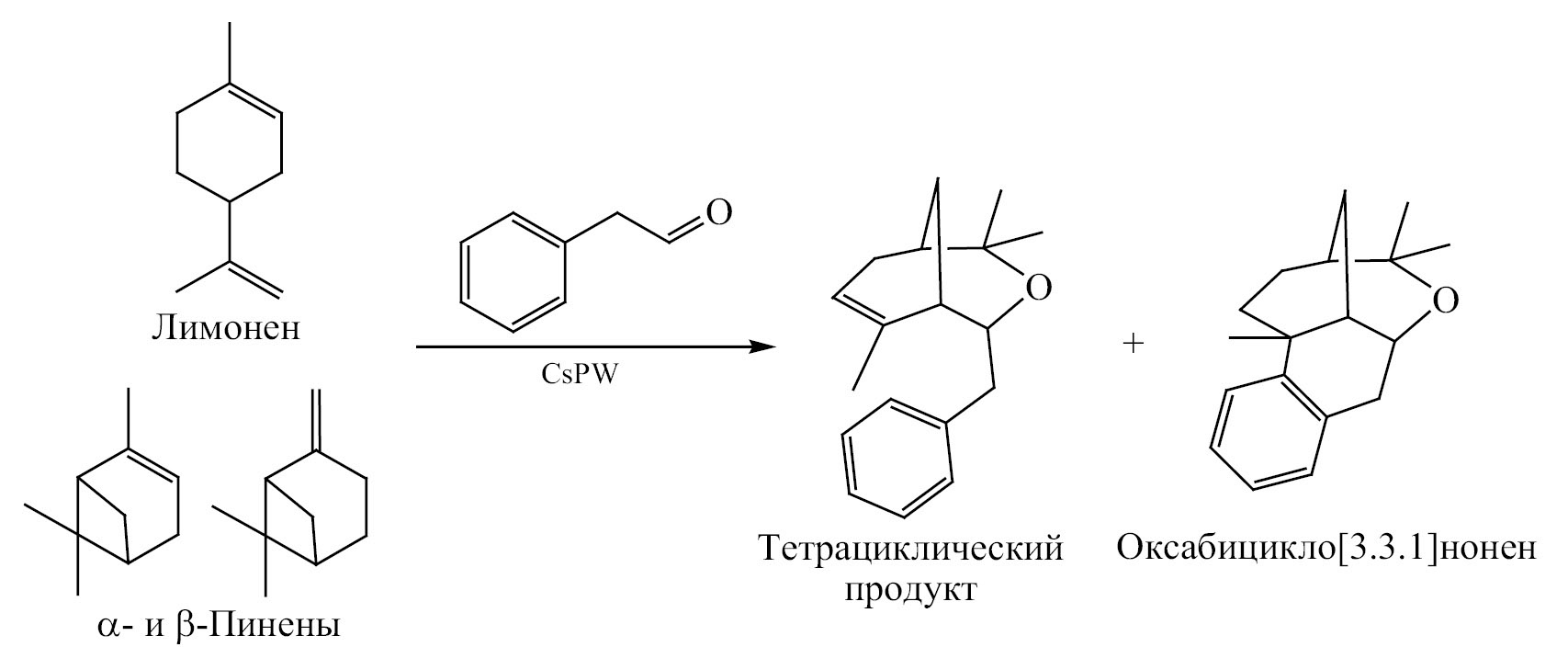Катализируемый цезиевой солью вольфрамофосфорной кислоты (CsPW) однореакторный процесс получения полициклических соединений, предполагающий конденсацию фенилацетальдегида с доступными монотерпенами (лимонен, α- и β-пинены), разработан в работе [67] (схема 13). Хотя в подобных процессах, как правило, образуются соединения со структурой 3-оксабицикло[3.3.1]нонена, наблюдается формирование продукта реакции Принса–Фриделя–Крафтса с конденсированной тетрациклической структурой и выходами до 78.0%. Процесс протекает в мягких условиях и «зеленых» растворителях, а катализатор CsPW является устойчивым к личингу [67].