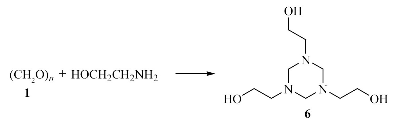 Следует отметить, что данный реагент помимо бактерицидной эффективности способен связывать сероводород, так как применяемый в качестве катализатора деструкции полиоксиметилена моноэтаноламин превращается при взаимодействии с формальдегидом в 1,3,5-три-(2-гидроксиэтил)гексагидро-s-триазин 6 (схема 2), который не только связывает сероводород в результате реакции замещения, но и является низкотоксичным биоцидом эффективным против бактерий, грибков и дрожжей [11–13].