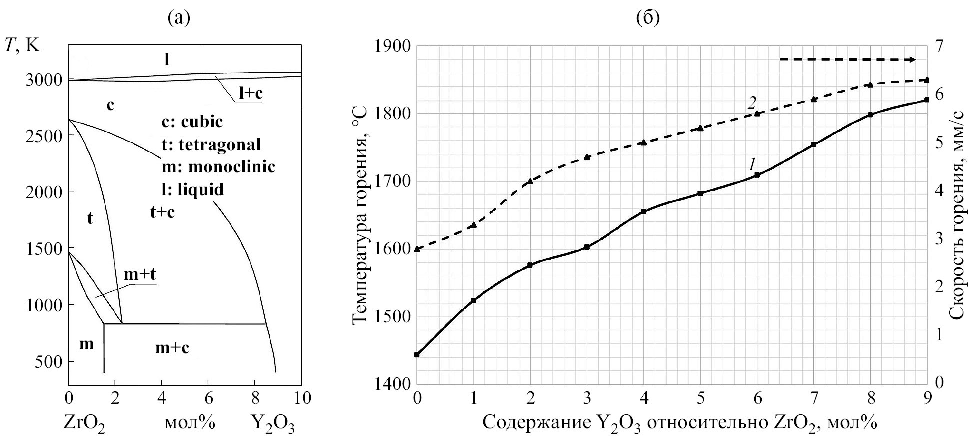 Рис. 1. Диаграмма состояния системы ZrO2–Y2O3 [35] (а) и зависимость температуры (1) и скорости горения исследуемых материалов (2) от содержания Y2O3 (б).