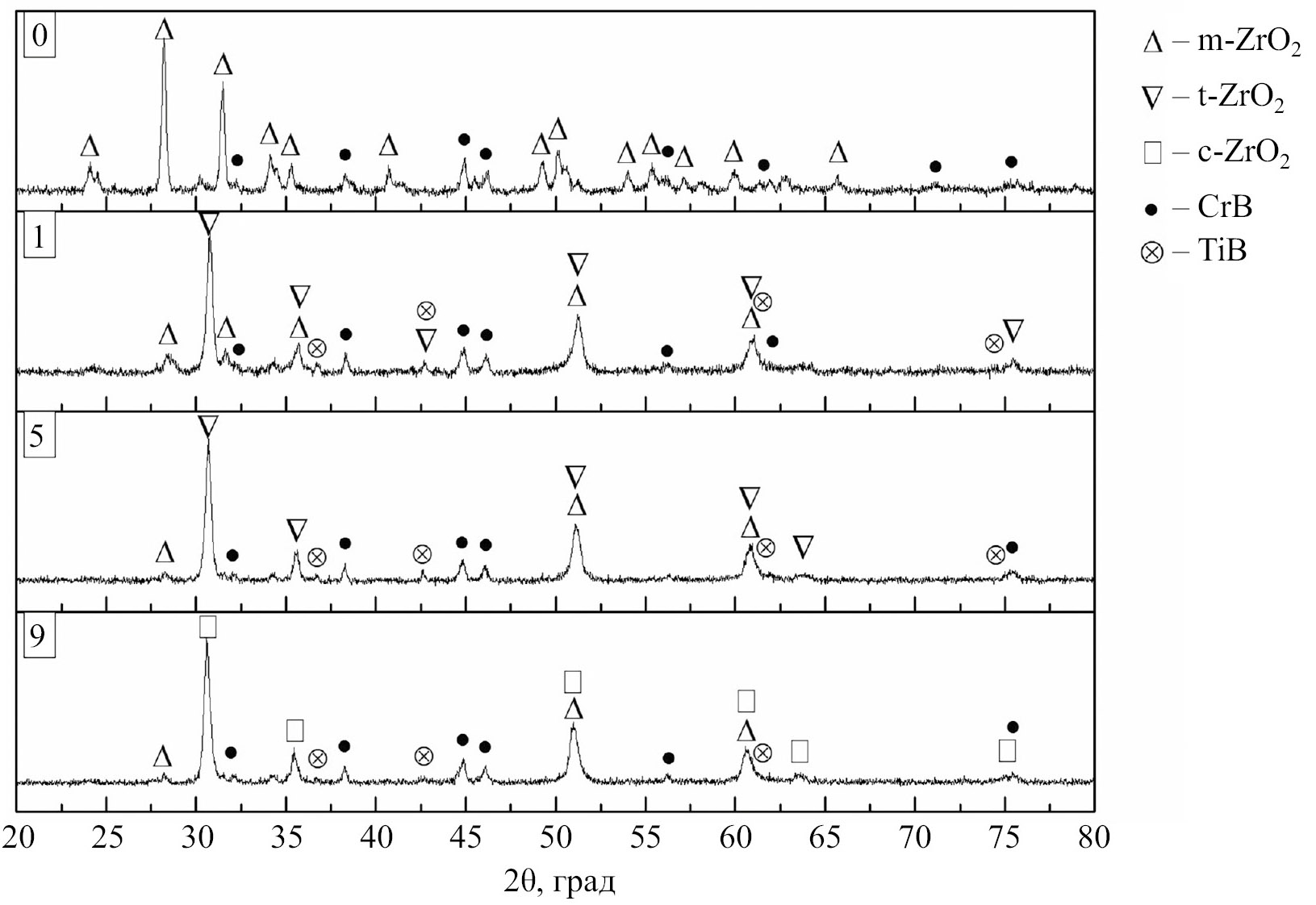 Согласно результатам РФА (рис. 3), продукты синтеза выбранных объектов исследования представляли собой композиционные материалы и состояли из четырех фаз, а именно моноклинного оксида циркония, стабилизированной модификации ZrO2, борида хрома и борида титана (табл. 2). Поскольку процесс синтеза осуществлялся с использованием асбестовой изоляции, а также в кварцевом стакане, предотвращающем контакт получаемых материалов с воздухом, в продуктах не наблюдалось образование побочных фаз, таких как оксид и нитрид титана. При этом в результате самораспространяющегося высокотемпературного синтеза исходной смеси без стабилизирующей добавки (образец № 0) было получено наибольшее количество моноклинной модификации ZrO2 – 70 мас% (табл. 2). При увеличении содержания Y2O3 в исходной системе до 1 мас% в продуктах синтеза (образец № 1) наблюдалось резкое снижение количества моноклинной модификации и увеличение доли тетрагонального ZrO2. Максимальное содержание тетрагональной модификации достигается при содержании стабилизирующей добавки 4.8 мас% (образец № 5). При увеличении доли Y2O3 в исходной смеси до 8.6 мас% в продуктах синтеза наблюдалась кубическая модификация оксида циркония. Формирование кубической модификации ZrO2 происходит в результате того, что продукты синтеза образца № 9 формируются в условиях, соответствующих участку фазовой диаграммы ZrO2–Y2O3 (рис. 1а), на котором наблюдается однофазная область кубического ZrO2. Формирование продуктов синтеза состава № 9 происходит при температуре 1820℃ и содержании Y2O3 9 мол% в соотношении (100–х)ZrO2/xY2O3.