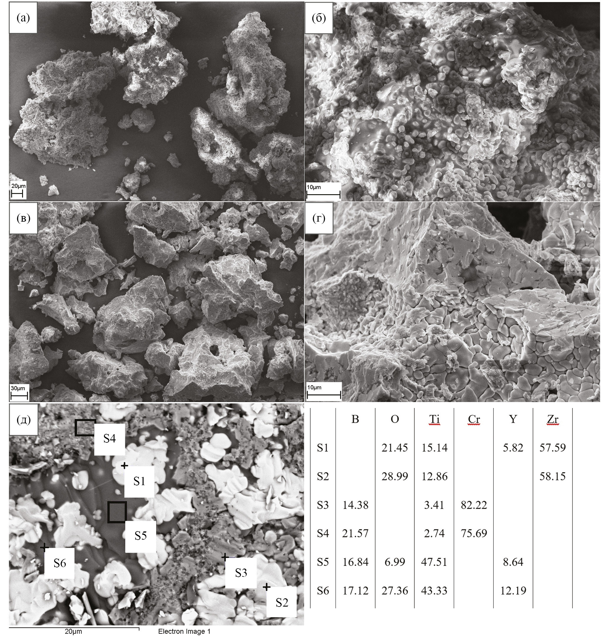 Согласно результатам сканирующей электронной микроскопии, введение стабилизирующей добавки в исходную систему оказывает влияние на микроструктуру продуктов синтеза. На рис. 4а и 4в приведены микрофотографии морфологии полученных порошков без Y2O3 и его содержанием 4.8 мас% (образцы № 0, 5). Как видно из данного рисунка, частицы синтезированного порошка образца № 0 имеют более рыхлую и губчатую морфологию, в то время как частицы порошка образца № 5 имеют оскольчатую морфологию. Кроме того, продукты синтеза без стабилизирующей добавки имеют более мелкий размер кристаллитов. Так, продукты синтеза образца № 0 имеют средний размер частиц ZrO2 около 2 мкм (рис. 4б), в то время как в образце № 5 средний размер частиц оксида циркония составил около 5 мкм (рис. 4г). Поскольку увеличение содержания Y2O3 приводит к увеличению температуры горения синтезированных материалов, это приводит к более глубокому протеканию процессов рекристаллизации и увеличению среднего размера частиц в продуктах синтеза. На рис. 4д приведена микрофотография структуры образца № 9, характерная для всех синтезированных материалов. Из рисунка видно, что синтезированные материалы имеют композиционную структуру. На данном рисунке светлые области (спектр S1 и S2) соответствуют агломератам частиц диоксида циркония, серые области (спектр S3 и S4) соответствуют бориду хрома и наиболее темные (спектр S5 и S6) – бориду титана.