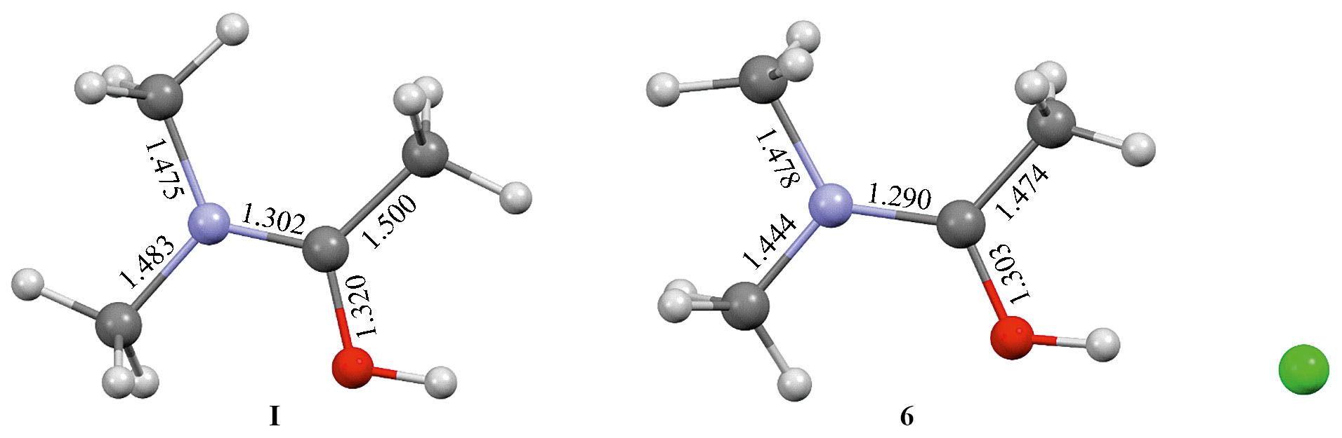 Рис. 2. Расчетная структура катиона монопротонированного N,N-диметилацетамида I и экспериментальная молекулярная структура гидрохлорида N,N-диметилацетамида 6 [46].