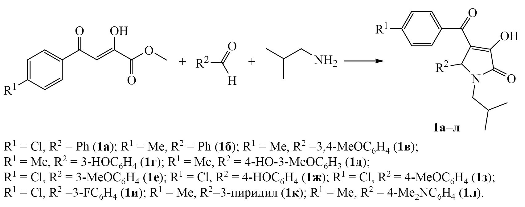 3-Гидрокси-1-изобутил-5-фенил-4-(4-хлорбензоил)-3-пирролин-2-он (1а). К раствору 0.01 моль (2.4 г) метилового эфира 4-хлорбензоилпировиноградной кислоты и 0.01 моль (1.06 г) бензальдегида в 10 мл диоксана добавляли 0.01 моль (0.73 г) изобутиламина. Реакционную смесь слегка нагревали при перемешивании до растворения всех компонентов и выдерживали в течение суток при комнатной температуре (23–25°C). Осадок отфильтровывали и перекресталлизовывали из этилового спирта. Выход 74%, т. пл. 262–264°C. ИК спектр, ν, см⁻¹: 1628 (C=O), 1682 (CON), 3128 (C³OH). Спектр ЯМР ¹H (ДМСО-d6), δ, м. д.: 11.32 уш. с (1H, C³OH), 7.70 д (2H, м-CHбензоил, J 8.5 Гц), 7.51 д (2H, o-CHбензоил, J 8.5 Гц), 7.39–7.25 м (5H, Ar), 5.44 с (1H, C⁵Hпиррол), 3.36 д. д (1H, CαHAHB, J 13.6, 8.9 Гц), 2.48 д. д (1H, CαHAHB, J 13.6, 6.1 Гц), 1.82 д. д (1H, CβH, J 13.1, 6.5 Гц), 0.80 д (3H, CγH₃, J 6.7 Гц), 0.77 д (3H, CγH₃, J 6.6 Гц). Спектр ЯМР ¹³C (ДМСО-d6), δС, м. д.: 187.66 (C=Oбензоил), 165.15 (C²=O), 151.69 (C³), 137.12 (Ar), 136.74 (Ar), 136.12 (Ar), 130.39 (Ar), 128.53 (Ar), 128.19 (Ar), 128.14 (Ar), 127.54 (Ar), 118.95 (C⁴), 61.11 (C⁵), 47.61 (CαH₂), 26.75 (CβH), 19.94 (CγH₃), 19.63 (CγH₃). Найдено, %: C 68.31; H 5.40; N 3.91. C21H20ClNO3. Вычислено, %: C 68.20; H 5.45; N 3.78.