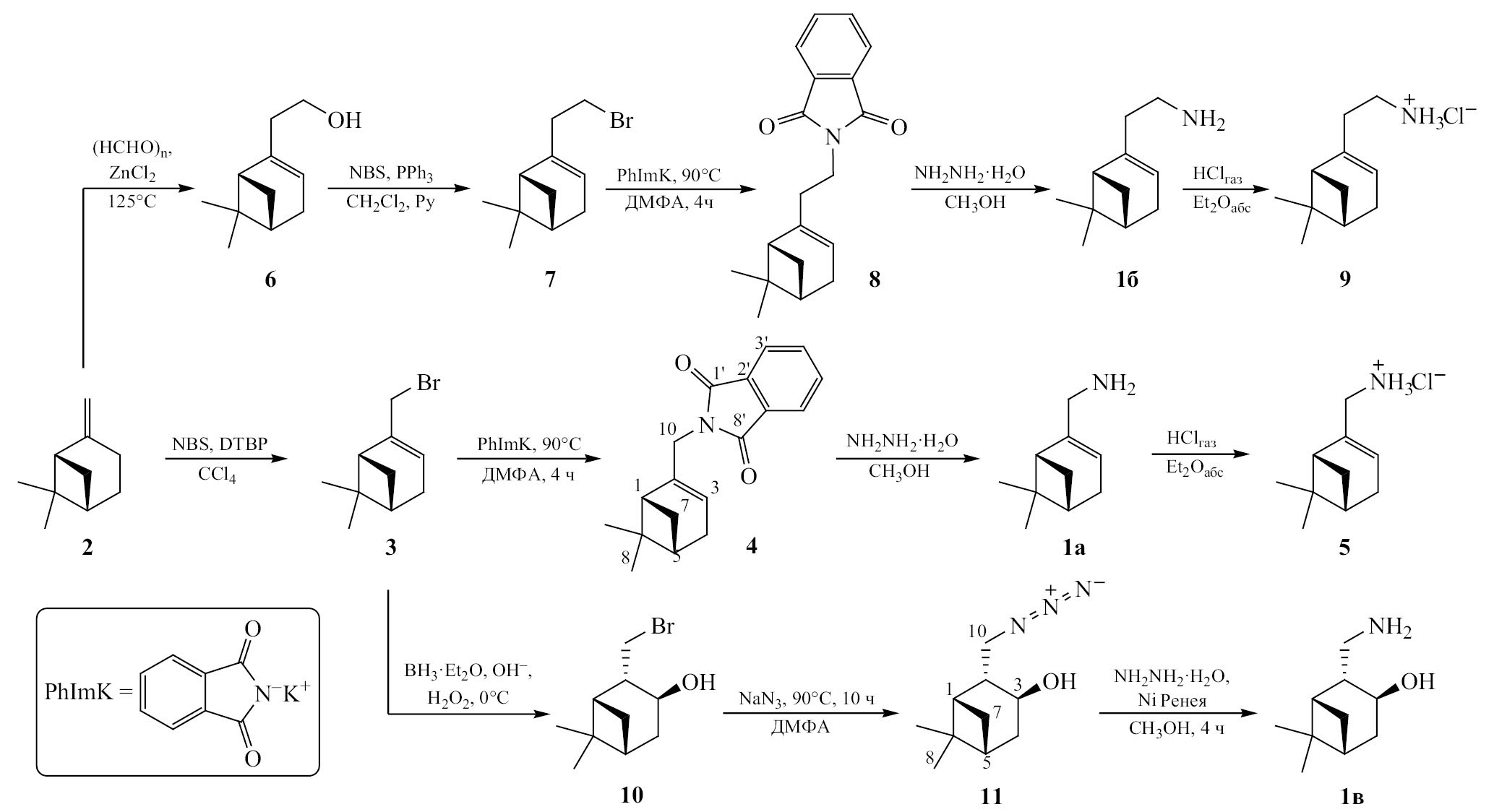 Для получения (–)-миртениламина 1a (схема 2) на первой стадии реакцией (–)-β-пинена 2 с N-бромсукцинимидом (NBS) и ди-трет-бутилпероксидом (DTBP) в CCl4 по известной методике [16] синтезировали миртенилбромид 3. Далее по методу Габриэля из миртенилбромида 3 под действием фталимида калия при 90°C в диметилформамиде (ДМФА) получали N-миртенилфталимид 4, из которого реакцией с гидразингидратом в этаноле образуется миртениламин 1a. Гидрохлорид миртениламина 5 осаждали пропусканием газообразного HCl над раствором миртениламина 1a в абсолютном диэтиловом эфире.