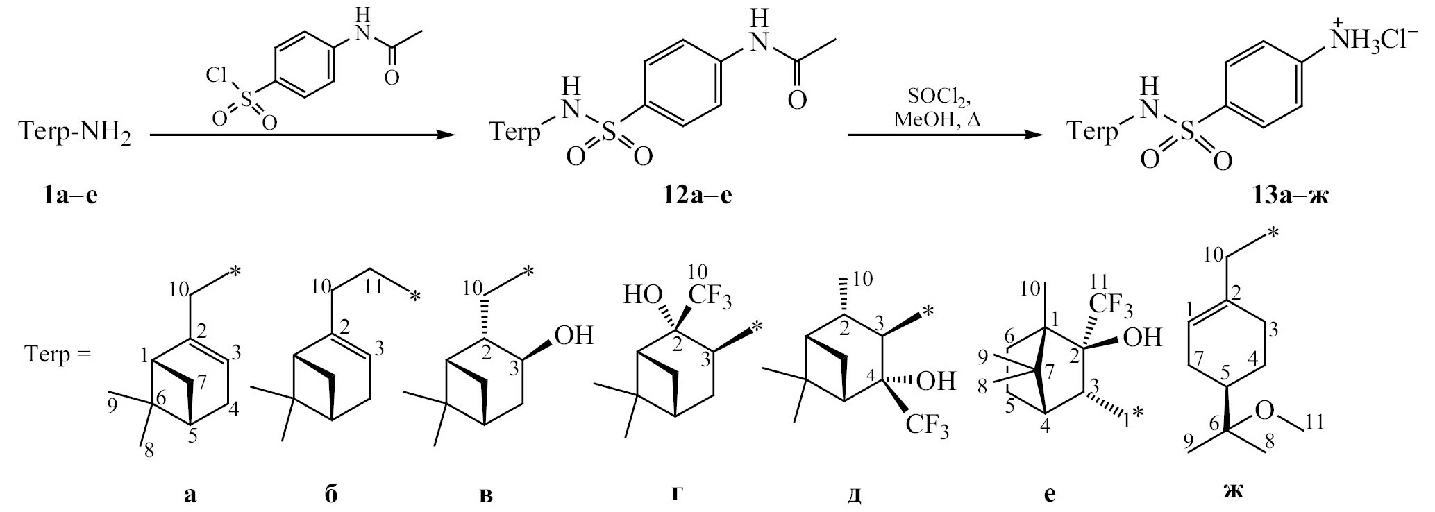 Реакцией терпеновых аминов 1a–е с N-ацетилсульфанилилхлоридом синтезированы сульфонамиды 12a–е (схема 3). Сульфонамиды 12а–в получали в PriOH при охлаждении до 0°C, время синтеза составляло 2 ч в присутствии триэтиламина, выходы составили 74–98%. В данных условиях реакции СF3-аминов 1г–е с N-ацетилсульфанилилхлоридом протекали менее селективно, поэтому условия синтеза были оптимизированы: реакции проводили в атмосфере аргона в сухом пиридине в присутствии катализатора диметиламинопиридина (DMAP) в течение суток. Выходы СF3-сульфонамидов 12г–е составили 38–45%.