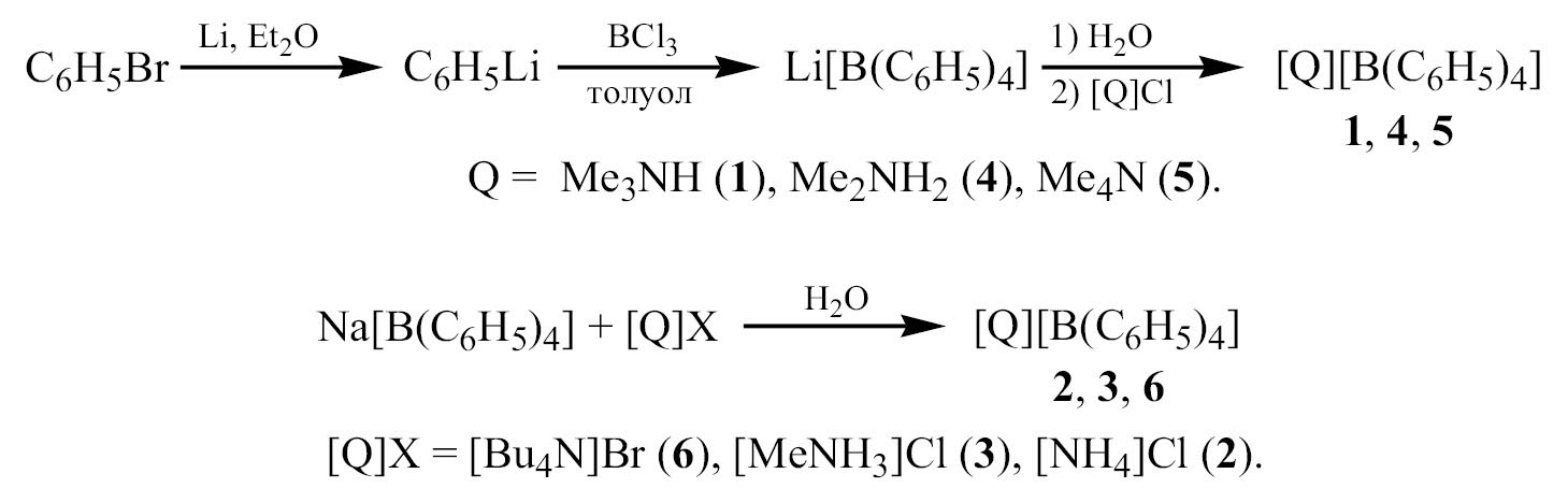 Для определения зависимости температуры начала термолиза солей [Q][BAr4] от природы катиона мы синтезировали тетрафенилбораты триметиламмония (1), аммония (2), метиламмония (3), диметиламмония (4), тетраметиламмония (5) и тетрабутиламмония (6) (схема 1). В отличие от триарилборанов, соли аммония [Q][BAr4] (Q = AlknNH4–n) легко получаются арилированием тригалогеноборанов BX3, аддуктов BX3∙OEt2 (X = F, Cl) или тетрафторбората натрия действием ариллития или галогенида арилмагния, осаждаются при смешивании раствора промежуточного продукта M[BAr4] с водным раствором [Q]X и устойчивы к окислению на воздухе [3]. Некоторые соли получали из коммерчески доступных натриевых солей.