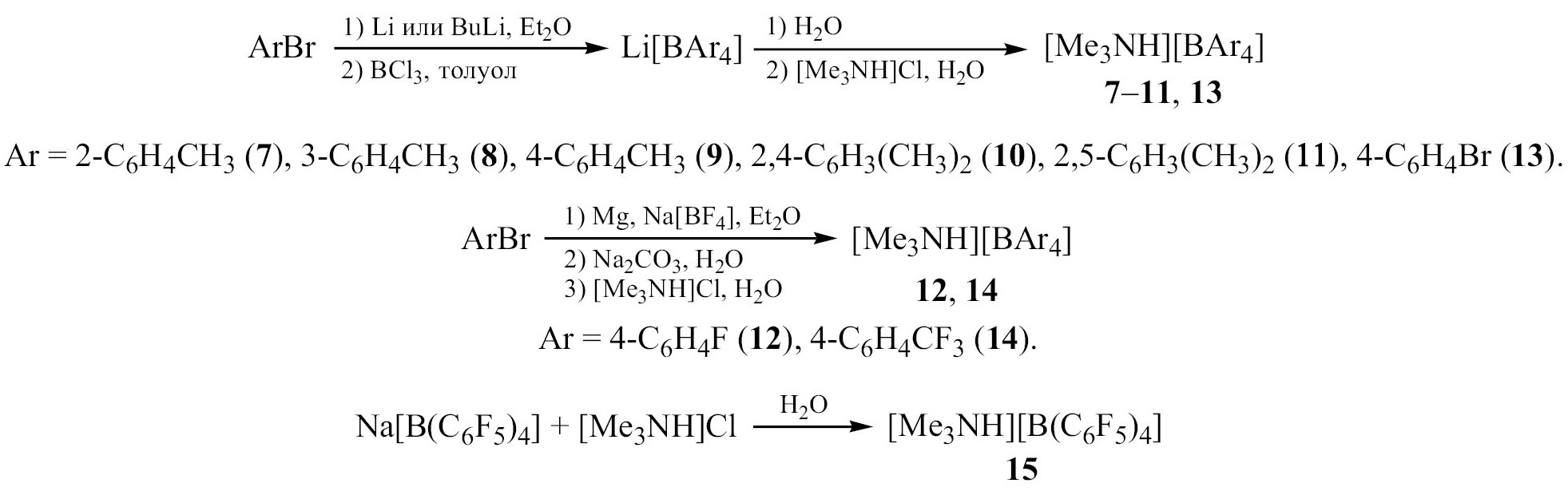 Дальнейшие исследования проводили с триметиламмониевыми солями тетракис(2-толил)бората (7), тетракис(3-толил)бората (8), тетракис(4-толил)бората (9), тетракис(2,4-ксилил)бората (10), тетракис(2,5-ксилил)бората (11), тетракис(4-фторфенил)бората (12), тетракис(4-бромфенил)бората (13), тетракис(4-трифторметилфенил)бората (14) и тетракис(пентафторфенил)бората (15), синтез которых представлен на схеме 2.