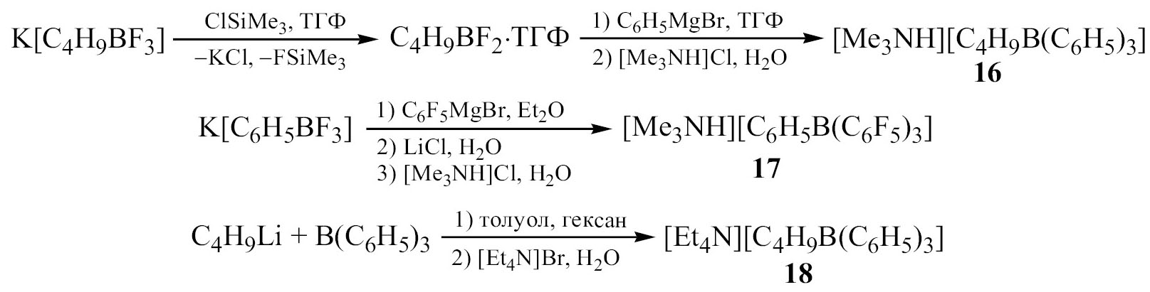 [Me3NH][C4H9B(C6H5)3] (16) | 113 | 130 | 30 | 33г, 26д |