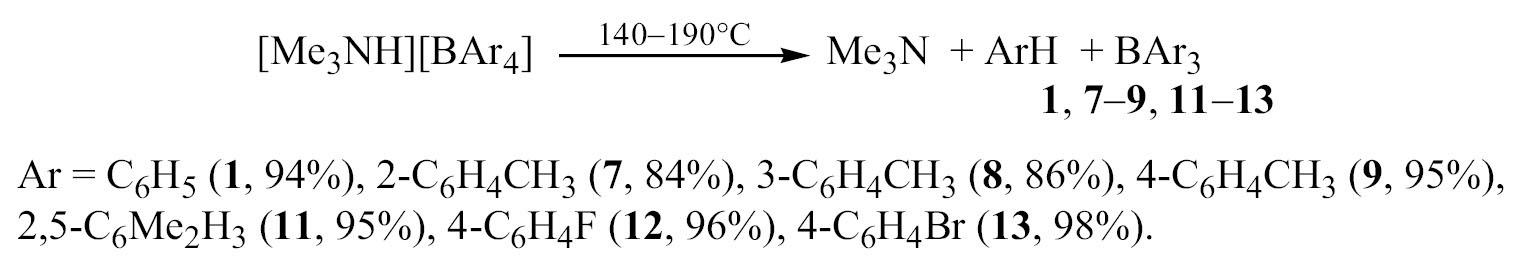 Триарилбораны широко применяются в органическом синтезе [1]. Методы их получения довольно разнообразны [2, 3], но основным способом является замещение галогена или алкокси(арилокси)группы в боранах BX3 (X = F, Cl, Br, OAlk, OAr) или в аддуктах BF3∙OAlk2 действием ариллития или галогенида арилмагния. Этот метод пригоден для наработки десятков или сотен граммов BAr3, но неудобен для получения меньших количеств, так как высококипящий твердый продукт выделяют перегонкой при пониженном давлении в атмосфере инертного газа во избежание окисления в ArnB(OAr)3–n. Имея интерес к синтезу триарилборанов в малых количествах, мы обратили внимание на термолиз бората [Me3NH][B(С₆H5)4] 1 при 200°C, в результате которого образуются трифенилборан, бензол и триметиламин [4]. Отмечено, что соли [NH4][B(С₆H5)4] и [Me4N][B(С₆H5)4] разлагаются при 240 и 340°С соответственно, но продукты термолиза не указаны. В работах [5, 6] описано образование B(С₆H5)3 из [NH4][B(С₆H5)4], но без экспериментальных деталей. Синтез B(С₆H5)3 из бората 1 повторен в работах [7, 8]. Несмотря на простоту метода, трифенилборан является единственным представителем семейства BAr3, полученным этим способом.