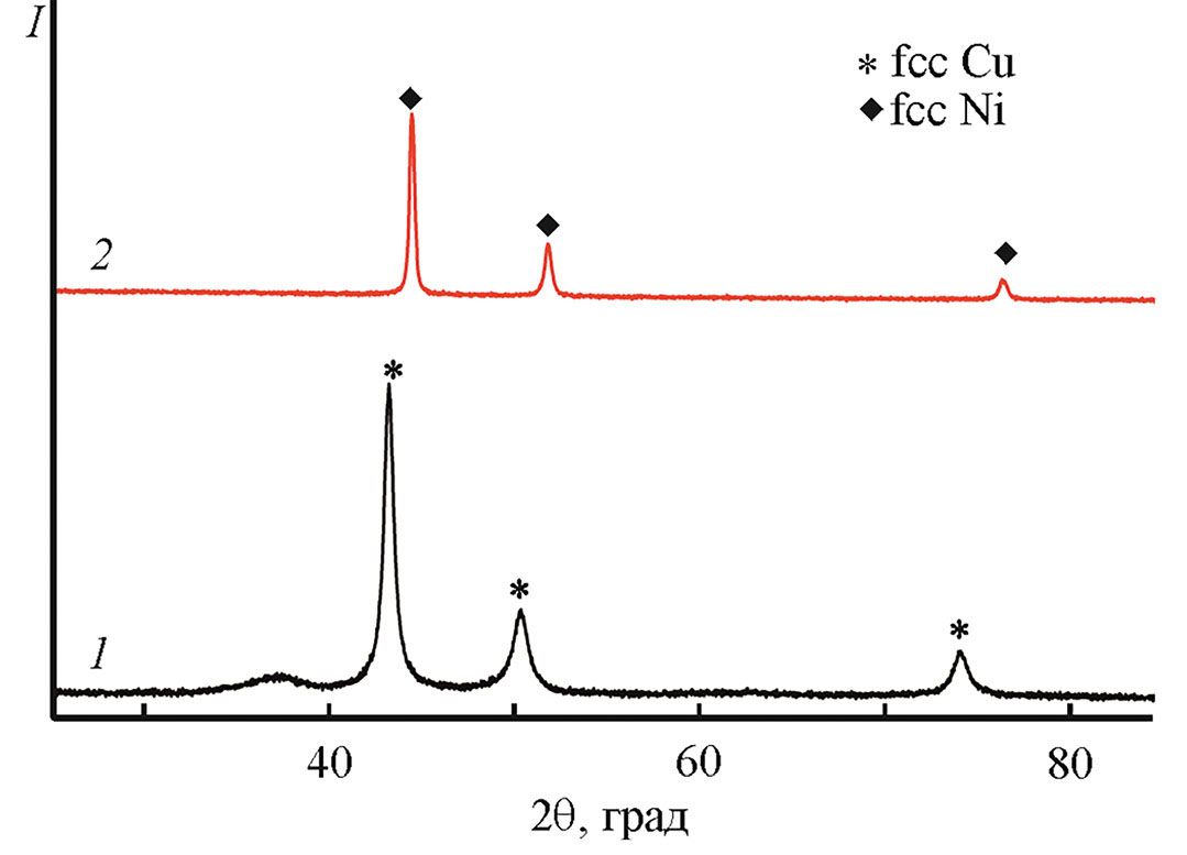 Рис. 1. Рентгенограммы наночастиц меди (1) и никеля (2), полученных в результате восстановления их каприлатов бензиловым спиртом при температуре 180°C.