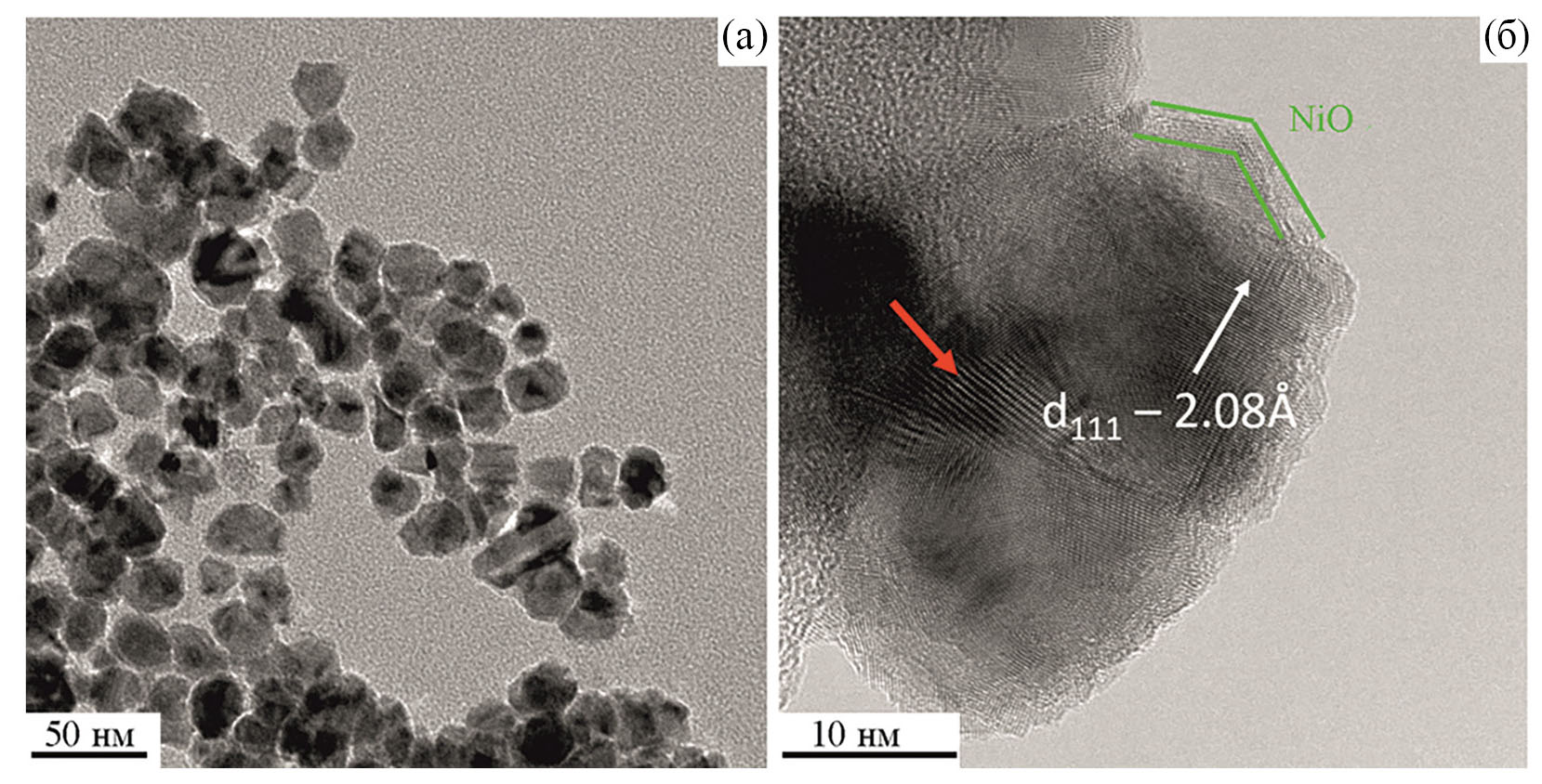 Для установления структуры образующихся биметаллических наночастиц методом просвечивающей электронной микроскопии высокого разрешения (ПЭМВР) был исследован образец Cu:Ni = 1:1, в котором по данным РФА наблюдалось образование ассиметричного пика на дифрактограмме. По данным ПЭМВР (рис. 4а) образец состоит из округлых частиц с размерами 20–40 нм, как это и было описано ранее. Исследование кристаллической структуры образца (рис. 4б) свидетельствует о наличии оксидной пленки толщиной 1–3 нм на поверхности частиц, состоящей из разориентированных кристаллитов NiO, показанной на снимке в виде зеленых маркерных линий, что согласуется с данными, полученными методом энергодисперсионной рентгеновской спектроскопии. Частицы сплавов состоят из кристаллитов размером порядка 10 нм, большая часть которых когерентно связана друг с другом. Кроме того, на изображениях ПЭМВР наблюдаются полосы Муара, образующиеся в результате пересечения кристаллических решеток с близкими межплоскостными расстояниями (показаны красной стрелкой). Измерения межплоскостных расстояний показали их соответствие ГЦК структуре, характерной для Ni или Cu, однако точность измерения межплоскостных расстояний не достаточна для определения состава твердых растворов, поскольку d111 для Ni и Cu очень близки и равны 2.03 и 2.08 Å соответственно.