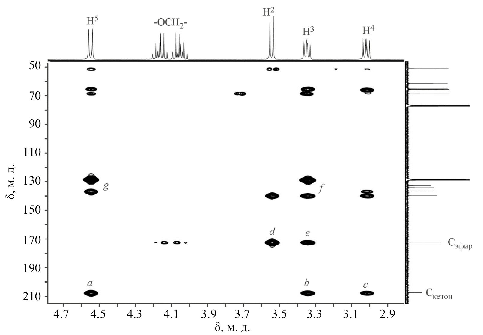 Региоселективность процесса 1,3-диполярного циклоприсоединения и положение заместителей определяли на основании HMBC-спектра (рис. 2). Наличие кето-группы в положении 4 устанавливали по взаимодействию третьего порядка между углеродом C=О и протонами Н5 и Н3 (кросс-пики a и b соответственно) и взаимодействию второго порядка с протоном Н4 (кросс-пик c). Положение сложноэфирной группы определяли по взаимодействию второго и третьего порядков d и e соответственно (схема 2). Для каждого из протонов Н3 и Н5 наблюдаются пары кросс-пиков f и g, которые отвечают взаимодействию с ипсо- и орто-углеродами соответствующих ароматических фрагментов. Это позволяет однозначно определить положение данных заместителей.