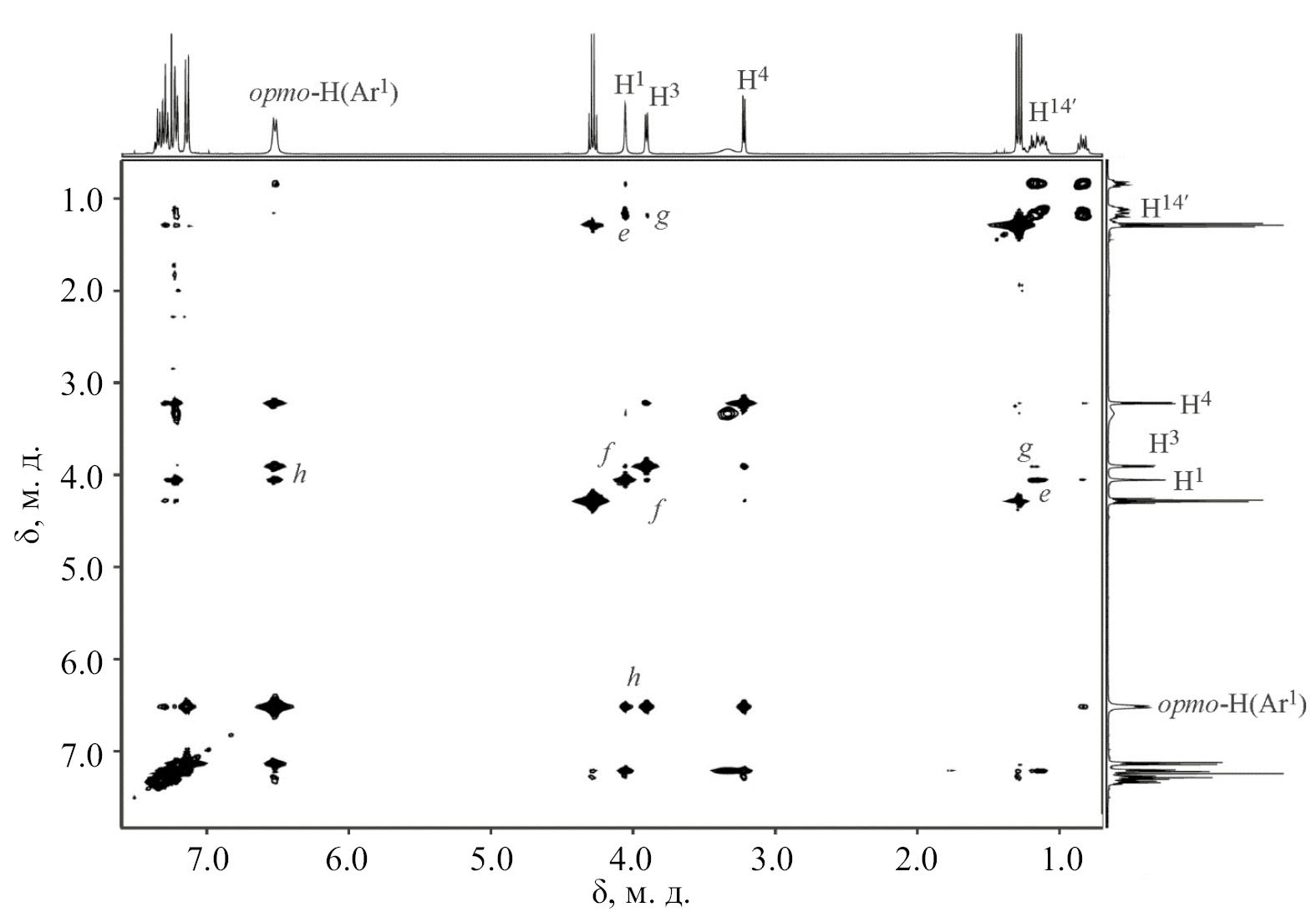 Пространственное строение данных соединений определяли посредством эксперимента 1H–1H NOESY (рис. 5). В спектре наблюдаются кросс-пики пространственно сближенных пар протонов Н1–Н14′ (e), Н3–Н14′ (g) и Н1–Н3 (f), что возможно лишь в случае относительного цис-расположения этих протонов и CH2-фрагмента триметиленового мостика (схема 5). Это подтверждается и наличием взаимодействия орто-протонов арильного заместителя в положении 4 с протонами Н1 и Н3, что возможно при относительном расположении данных протонов и арила по одну сторону гетероцикла (пара кросс-пиков h).
