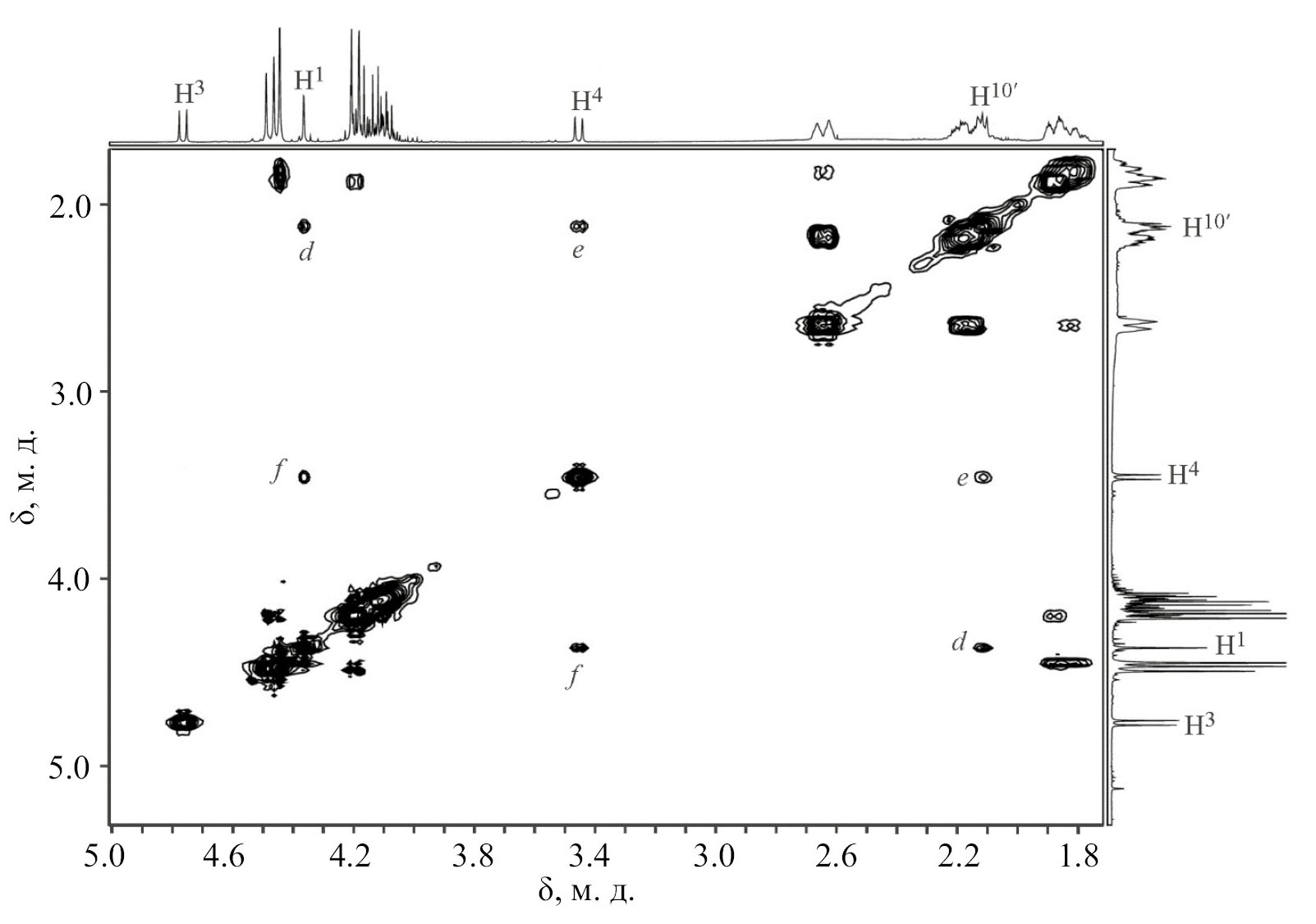 В ходе ЯМР-исследований соединения 14 обнаружено, что в дейтерохлороформе оно подвергается изомеризации. За 24 ч содержание изомера 14′ достигает 25%, по данным ЯМР 1Н. В индивидуальном виде продукт изомеризации выделен не был, его строение устанавливали на основании данных спектров 1H–13C HMBC и 1H–1H NOESY смеси. Положение заместителей для 14′ аналогично исходному соединению 14, что говорит о том, что углеродный скелет в данном процессе не затронут. В 1H–1H NOESY спектре (рис. 7) наблюдаются кросс-пики пространственно сближенных пар протонов Н1–Н10′ (d), Н4–Н10′ (e) и Н1–Н4 (f), что указывает на изменение конфигурации хиральных атомов углерода 3 и 4 (схема 7).